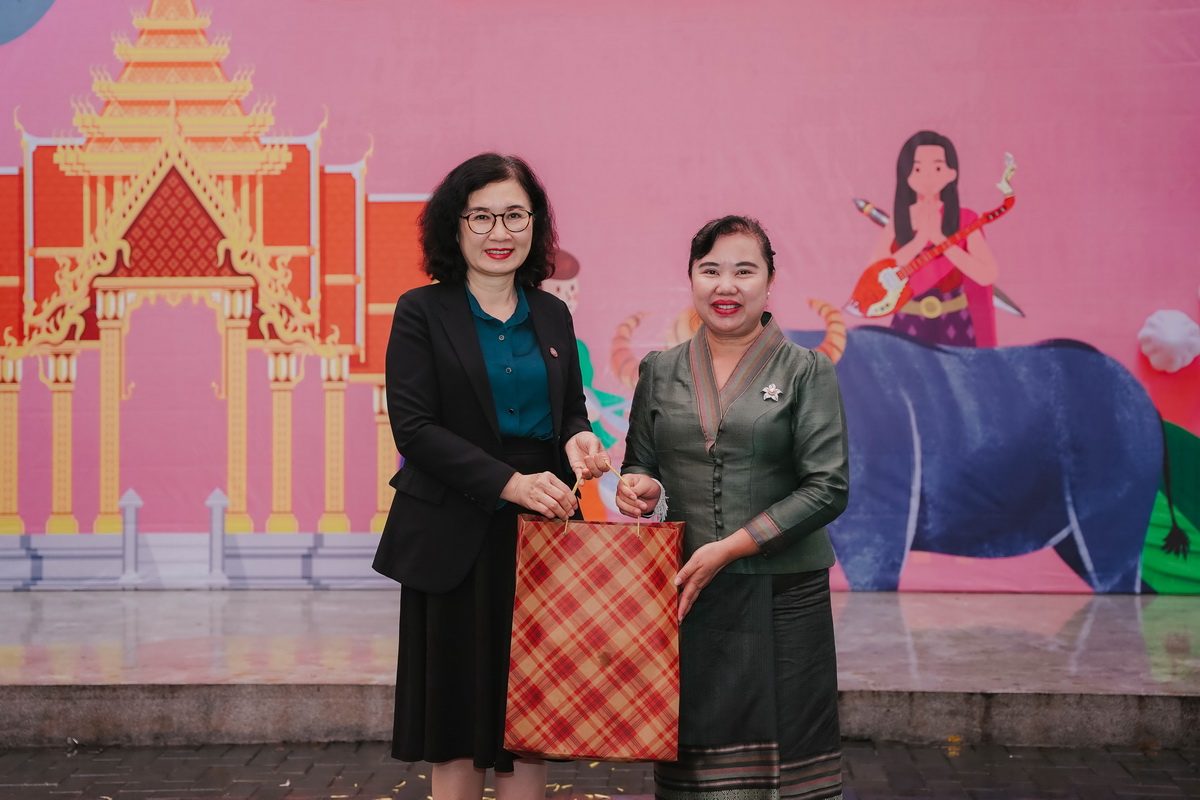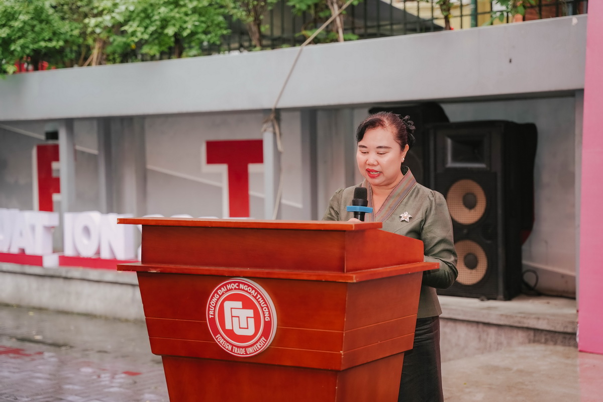Phát biểu tại buổi lễ, PGS TS Lê Thị Thu Thuỷ đã đại diện lãnh đạo nhà trường gửi đến các cán bộ đang công tác tại Đại sứ quán CHDCND Lào và toàn thể lưu học sinh Lào tại Trường ĐH Ngoại thương những món quà và lời chúc mừng năm mới đầy ý nghĩa, thể hiện sự quan tâm, tình cảm của lãnh đạo nhà trường dành cho lưu học sinh Lào đang theo học tại trường.