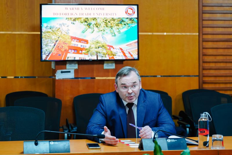 Ngài Sergei Androsov mới nhậm chức và đến Việt Nam được 02 tháng, đã lựa chọn Trường ĐH Ngoại thương là trường đại học đầu tiên để tới tìm hiểu về trường và phát triển kinh tế của Việt Nam. Ông rất quan tâm tới nền kinh tế của Việt Nam, những gì nền kinh tế đã trải qua và triển vọng phát triển trong thời gian tới. Lãnh đạo nhà trường đã giới thiệu về trường, cũng như chia sẻ các thông tin về kinh tế Việt Nam với ngài Sergei Androsov.