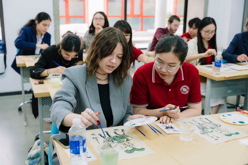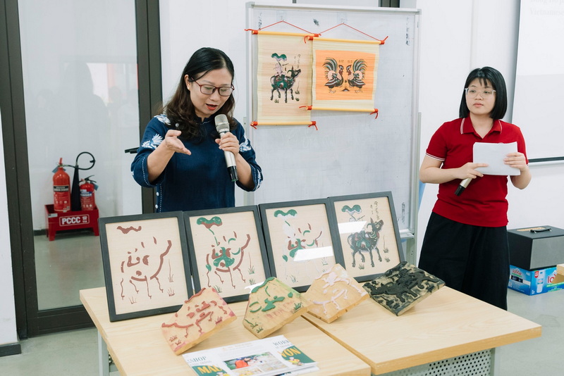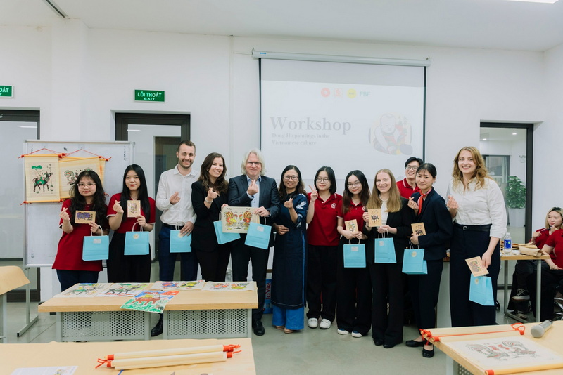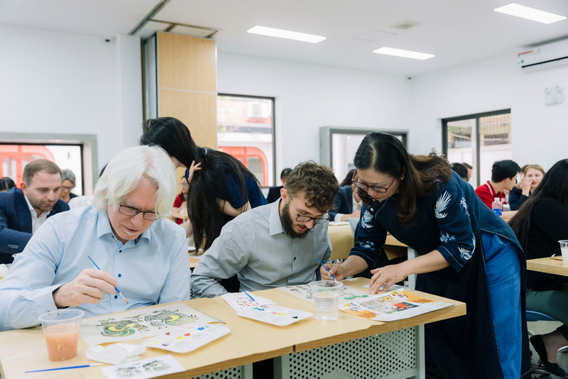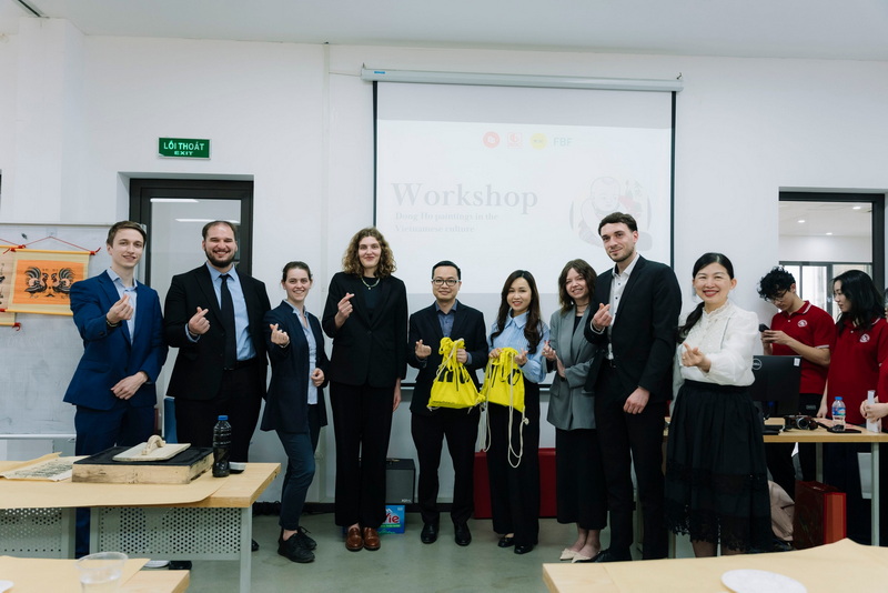 Trong khuôn khổ chương trình, các bạn sinh viên FHNW và sinh viên K61 Chương trình tiên tiến Tài chính Ngân hàng đã cùng tham gia workshop vẽ tranh dân gian Đông Hồ do ThS Nguyễn Thị Hữu – Sáng lập Dự án Magic Of Color điều phối. Thông qua hoạt động này, các bạn được tìm hiểu về lịch sử, kỹ thuật in tranh và tự tay hoàn thiện tác phẩm của mình. Đây là cơ hội quý báu để sinh viên quốc tế tiếp cận với di sản văn hóa Việt Nam theo cách trực quan, sinh động.