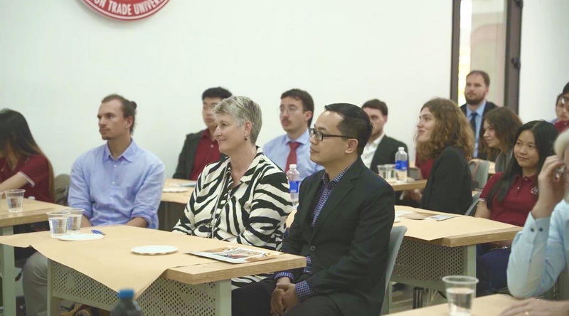 Tiếp và chào đón đoàn, về phía Khoa Tài chính - Ngân hàng, Trường ĐH Ngoại thương có PGS, TS Nguyễn Việt Dũng – Trưởng khoa cùng các cán bộ, giảng viên, đông đảo sinh viên K61 chương trình tiên tiến Tài chính - Ngân hàng.