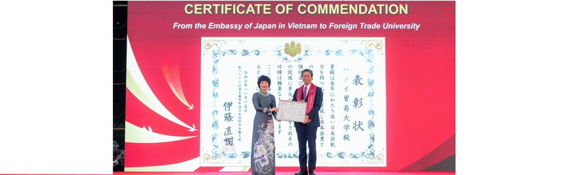 Tại chương trình kỷ niệm 65 năm thành lập Trường, Trường Đại học Ngoại Thương đã vinh dự nhận Bằng khen từ Ngài Ito Naoki - Đại sứ Đặc mệnh Toàn quyền Nhật Bản tại Việt Nam, ghi nhận những đóng góp của Nhà trường trong thúc đẩy hợp tác giáo dục giữa Việt Nam và Nhật Bản.