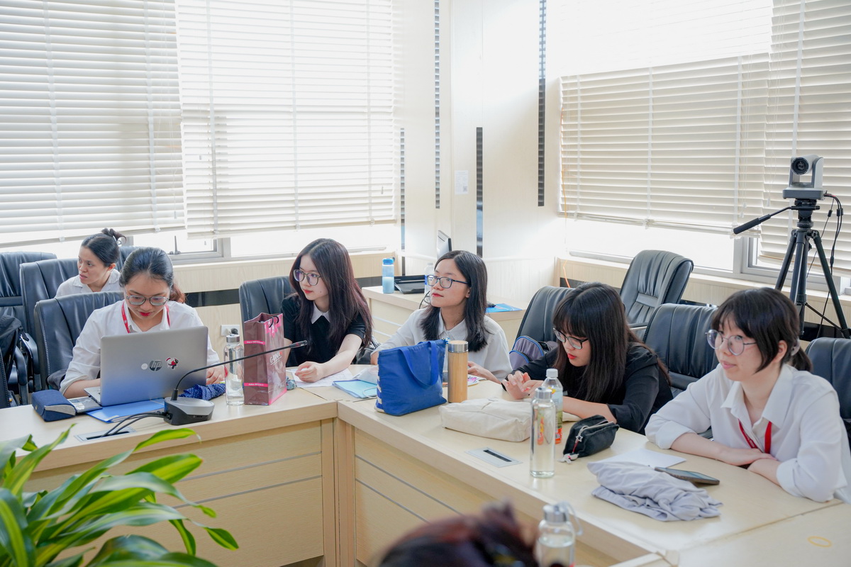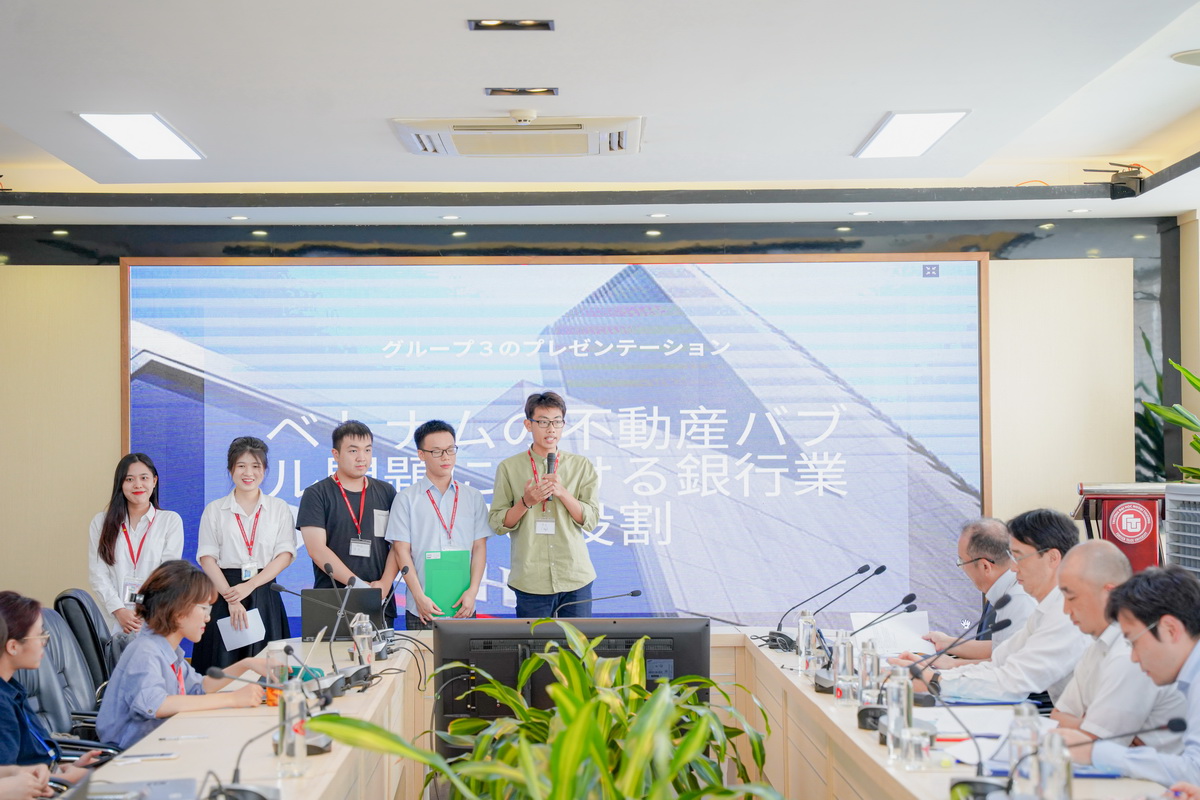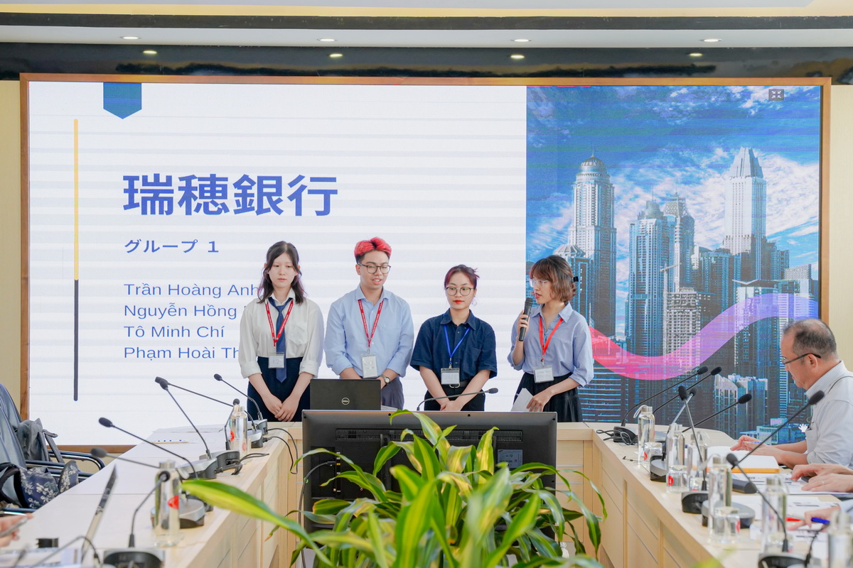 Cũng trong khuôn khổ chuyến thăm, các bạn sinh viên Khóa 59 Chương trình Chất lượng cao Tiếng Nhật thương mại đã có cơ hội báo cáo bài thu hoạch tới Lãnh đạo Ngân hàng Mizuho nằm trong khuôn khổ "Chương trình đào tạo về phương thức kinh doanh Nhật Bản" cũng như nêu những kỳ vọng của các em đối với ngân hàng.