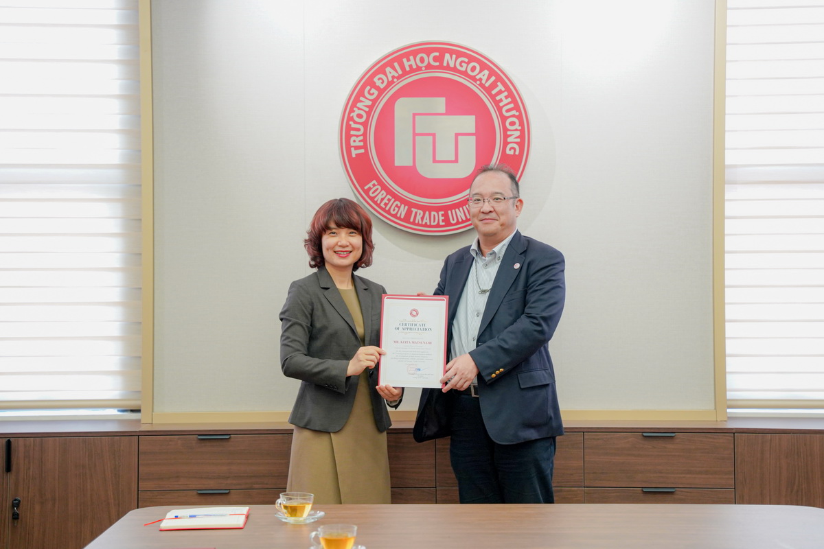 Tại buổi làm việc, PGS, TS Phạm Thu Hương – Phó Hiệu trưởng, Trường ĐH Ngoại thương đã trao chứng nhận hợp tác cùng quà kỷ niệm tới ông Matsunami Keita vì những đóng góp của ông trong mối quan hệ hợp tác giữa hai đơn vị thời gian qua.