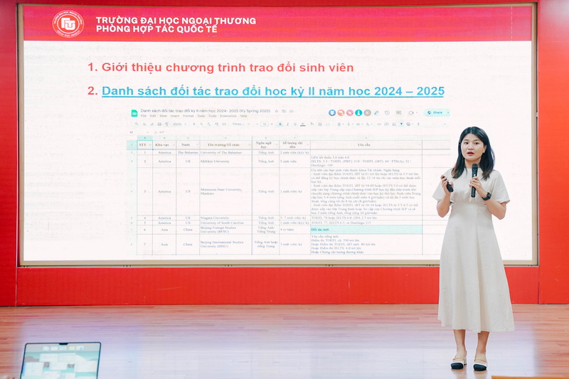 Ngày 19/8/2024, Trường ĐH Ngoại thương đã tổ chức Buổi Giới thiệu và Tư vấn thông tin về chương trình trao đổi sinh viên cho học kỳ II năm học 2024 - 2025.