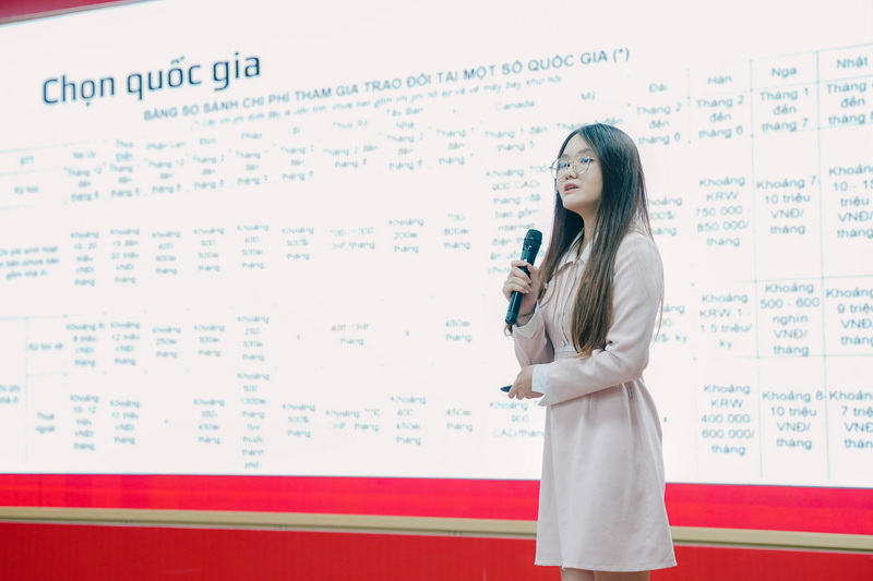 Buổi Giới thiệu và Tư vấn thông tin còn trở nên ý nghĩa và hữu ích hơn cùng với sự đồng hành của các bạn cựu sinh viên trao đổi – những sinh viên vừa hoàn thành kỳ học trao đổi tại Hàn Quốc, Nga, Pháp... Đại diện của các bạn cựu sinh viên trao đổi đã có những phần phần chia sẻ về kinh nghiệm và trải nghiệm của các bạn về kế hoạch tham gia chương trình trao đổi, những sự chuẩn bị cần có cả về học tập và tâm lý từ trước khi đăng ký tham gia trao đổi, cho tới giai đoạn trong và sau khi kết thúc kỳ học tập tại trường đối tác để có một tâm lý vững vàng, và tinh thần sẵn sàng đón nhận những kỷ niệm đẹp trong kỳ trao đổi. Phần chia sẻ của các cá nhân được đồng cảm bởi các bạn cựu sinh viên từng đi trao đổi đã gây ấn tượng và khích lệ các bạn sinh viên đang ấp ủ giấc mơ tham gia chương trình trao đổi.
