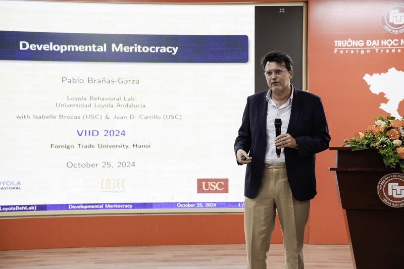 Tại phiên toàn thể, các đại biểu đã lắng nghe bài tham luận đề dẫn “Developmental meritocracy” (tạm dịch "Chế độ trọng dụng nhân tài") do diễn giả chính của hội thảo, GS Pablo Branas-Garza - Tổng biên tập Tạp chí Journal of Behavioral and Experimental Economics (JBEE) trình bày. Bài tham luận tìm hiểu cách mọi người nhìn nhận sự bất bình đẳng và ảnh hưởng của tài năng, nỗ lực đến việc chấp nhận chính sách phân phối lại tài sản. Thí nghiệm với trẻ em và thanh thiếu niên cho thấy hầu hết không thay đổi cách phân chia tài sản, nam giới thường có xu hướng công bằng hơn và tài năng được đánh giá cao hơn nỗ lực. Các yếu tố như sự đồng cảm, bối cảnh xã hội cũng rất quan trọng trong cách mọi người nhìn nhận tài năng khi phân chia tài sản.