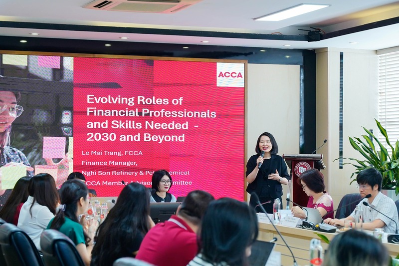 Tiếp nối các bài chia sẻ, Bà Kiều Thị Thu Trang (ACCA Việt Nam) đã chia sẻ về mục tiêu thúc đẩy phát triển bền vững và cách ACCA tích hợp các yếu tố ESG vào chương trình đào tạo, cũng như vai trò của ACCA trong việc xây dựng chính sách quốc gia liên quan đến kế toán, kiểm toán.