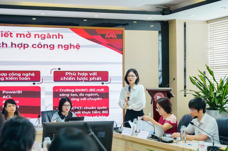 Mở đầu phần chia sẻ chuyên sâu, TS Lê Thị Vân Dung trình bày về định hướng mở ngành Kiểm toán đang được triển khai tại Trường ĐH Ngoại thương. Nổi bật là việc phát triển năng lực thực hành và tích hợp ba nhóm nội dung chiến lược: Phân tích và trực quan dữ liệu, công nghệ trong kiểm toán, luật và đạo đức nghề nghiệp, nhằm trang bị kiến thức và kỹ năng toàn diện cho sinh viên.