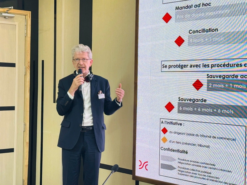 Về phía Pháp, các diễn giả gồm Ông Albert Franceskinj, Bà Véronique Dobelle và Ông Dominique Lévêque đã trình bày những vấn đề thực tiễn trong hệ thống Pháp, đặc biệt là cách các bên trong hợp đồng được bảo vệ quyền lợi mà vẫn đảm bảo trật tự công trong quá trình tái cấu trúc doanh nghiệp.