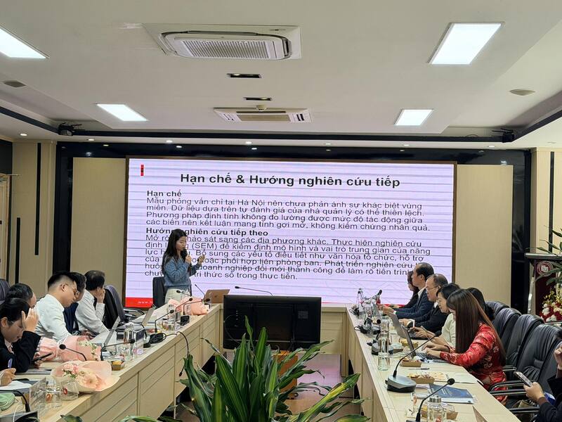 Phần tham luận sau đó diễn ra sôi nổi, với nhiều nghiên cứu thực tiễn xoay quanh năng lực số, hành vi đổi mới, tác động của AI trong quản trị, đổi mới mô hình kinh doanh và lĩnh vực xây dựng. Mỗi bài báo cáo mang đến những dữ liệu mới, gợi ý chính sách và khuyến nghị hữu ích cho cộng đồng nghiên cứu.