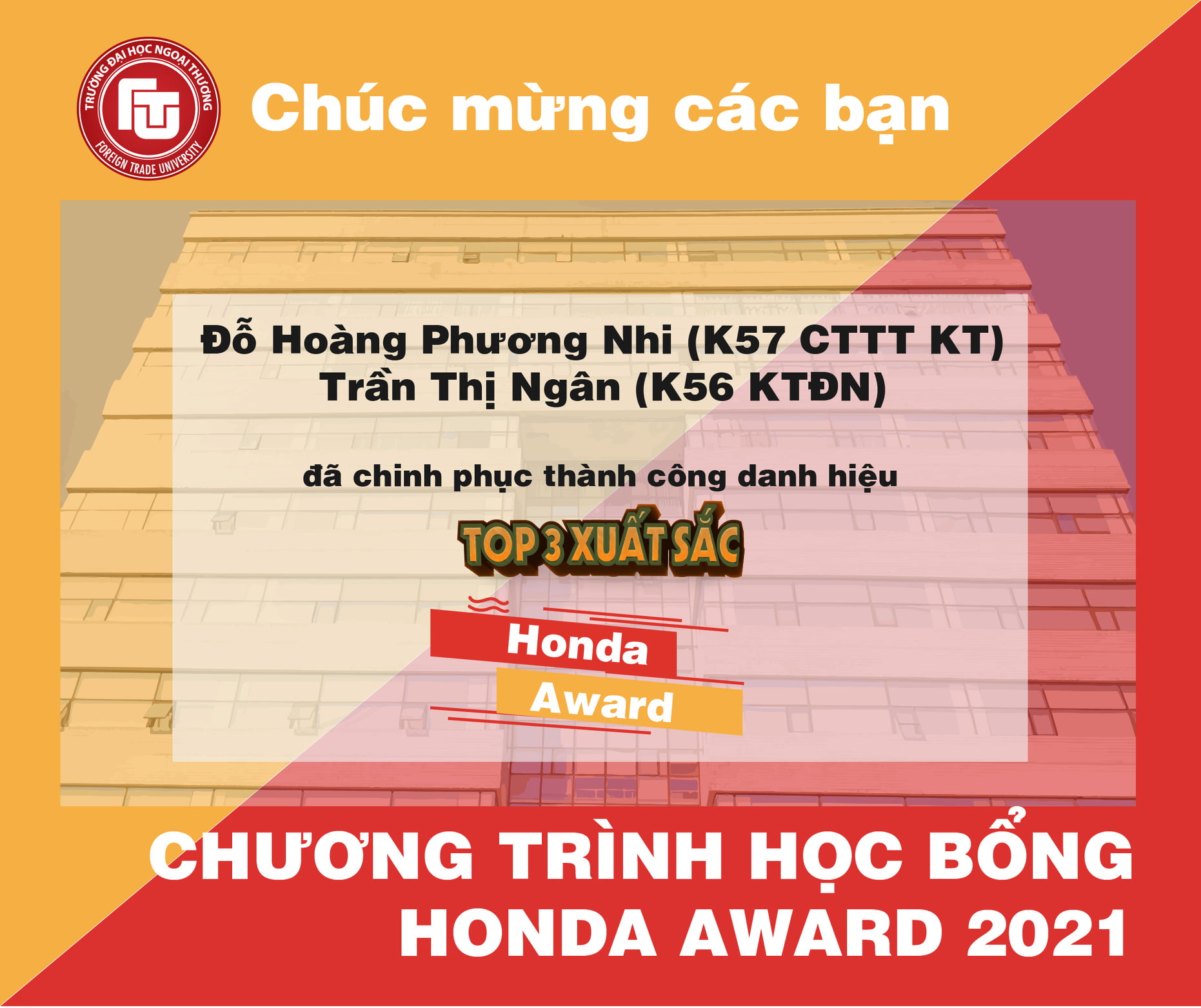 Theo tin mới nhận từ Honda Vietnam, 2 trong 3 danh hiệu "Top 3 xuất sắc" toàn quốc Học bổng Honda Award 2021 của khối ngành khác KH-KT đã được trao cho các sinh viên Trường Đại học Ngoại thương.