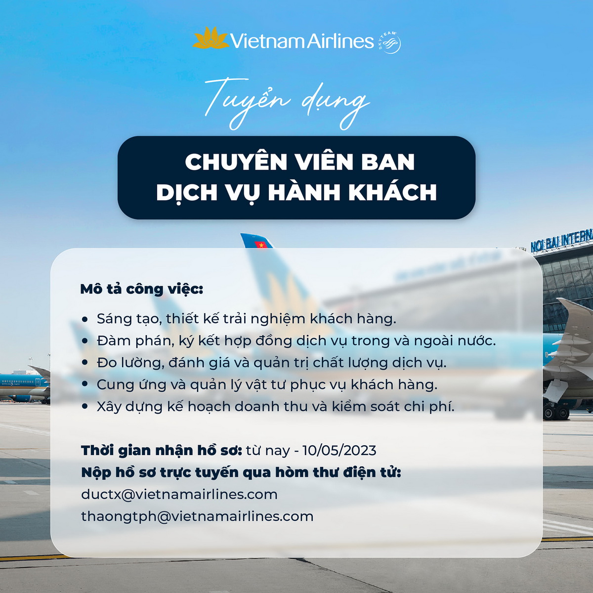 Tổng công ty Hàng không Việt Nam thông báo tuyển dụng 06 chuyên viên Ban Dịch vụ hành khách.