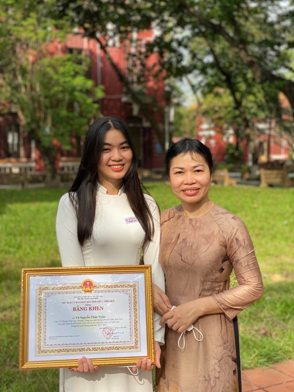 Nữ sinh này là 1 trong 3 học sinh xuất sắc nhất lớp 12 chuyên văn ở Trường Quốc học Huế. Không chỉ môn văn, các môn khác Thảo Ngân giỏi đều.