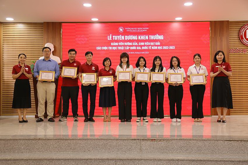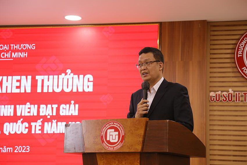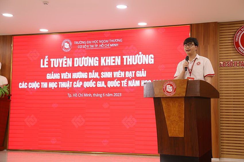 Đại diện cho sinh viên đạt giải, sinh viên Lê Nguyễn Quốc Hưng lớp K59CLC2 chia sẻ về những thành tích mà các bạn sinh viên đạt được không đơn thuần chỉ là sự nỗ lực tự thân của mỗi người, mà đó là thành quả chung từ sự tận tâm của quý thầy cô Ban Giám đốc, giảng viên hướng dẫn, các Ban, Bộ môn, Đoàn Thanh niên – Hội Sinh viên cho đến sự quan tâm, hỏi han và động viên nhau của từng bạn sinh viên Ngoại thương. Quốc Hưng cũng gửi lời tri ân chân thành và sâu sắc nhất đến các thầy cô, những người đã thầm lặng soi lối cho sinh viên có cơ hội mang tên tuổi mình làm rạng danh sắc màu Ngoại thương. Nhờ thầy cô tạo điều kiện mà sinh viên có thể cố gắng hết sức để đến với các cuộc thi, dám thay đổi, thể hiện bản thân và tỏa sáng với tài năng và quyết tâm thành công hơn trong tương lai.