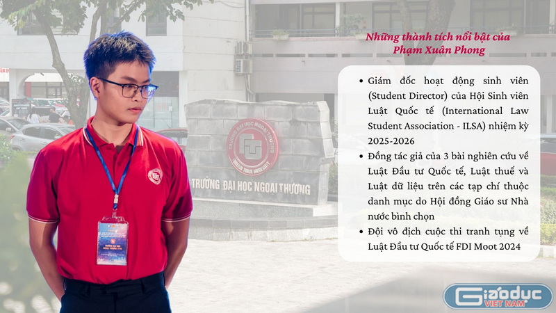 Từ một nam sinh lớp 12 trường THPT Chuyên Ngoại ngữ còn mơ hồ về tương lai, việc bén duyên với ngành Luật đã đưa Phạm Xuân Phong đến với FTU. Nói về lý do theo học chương trình Luật Kinh doanh quốc tế theo mô hình thực hành nghề nghiệp V-LEX tại FTU, Phong chia sẻ đầy tự hào: "FTU từ lâu đã được biết đến là môi trường học tập năng động, nơi quy tụ nhiều thế hệ sinh viên xuất sắc và giàu khát vọng. Đối với em, việc được học tập tại một ngôi trường như vậy chính là nền tảng quan trọng để phát triển toàn diện, không chỉ về chuyên môn mà còn về kỹ năng, thái độ và phẩm chất nghề nghiệp"