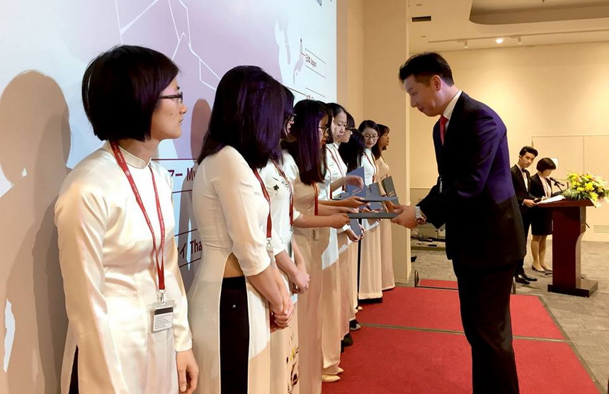 Các em sinh viên trường Đại học Ngoại thương nhận giấy chứng nhận học bổng của Tập đoàn Aeon Việt Nam
