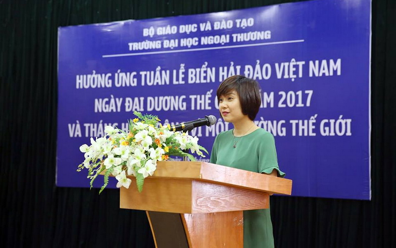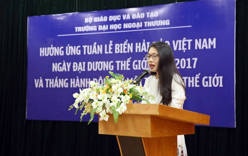 Đại diện Công đoàn trường, TS. Phạm Thu Hương đã phát biểu hưởng ứng, nhấn mạnh rằng Công đoàn trường ĐHNT sẽ là người đi đầu trong việc bảo vệ, giữ gìn môi trường biển đảo xanh sạch đẹp để các công đoàn viên trong toàn trường noi theo. Cũng tại buổi lễ, sinh viên Phạm Điệp Anh - Chủ tịch Hội sinh viên ĐHNT đã đại diện cho đoàn viên, thanh niên trong toàn trường, nói lên tiếng nói của giới trẻ, kêu gọi vai trò hết sức quan trọng của thanh niên trong việc nâng cao nhận thức của toàn xã hội về ý thức bảo vệ chủ quyền lãnh thổ trên biển của Tổ quốc, bảo vệ môi trường sống của mỗi chúng ta và bảo tồn sự đa dạng sinh học. Chia sẻ những kỷ niệm khó phai khi vinh dự được trở thành 1 trong 24 đại diện thanh niên tiêu biểu tham gia đoàn công tác thăm đảo Phú Quý thuộc tỉnh Bình Thuận, sinh viên Điệp Anh cảm thấy vô cùng tự hào và xúc động vì sự giàu có của biển đảo quê hương, về tình người ấm áp của những người dân trên đảo, qua đó, kêu gọi sinh viên trường ĐHNT hãy cùng chung tay góp phần bảo vệ những phần tài sản vô giá của đất nước, để duy trì sự sống mãi mãi xanh tươi trên hành tinh của chúng ta.