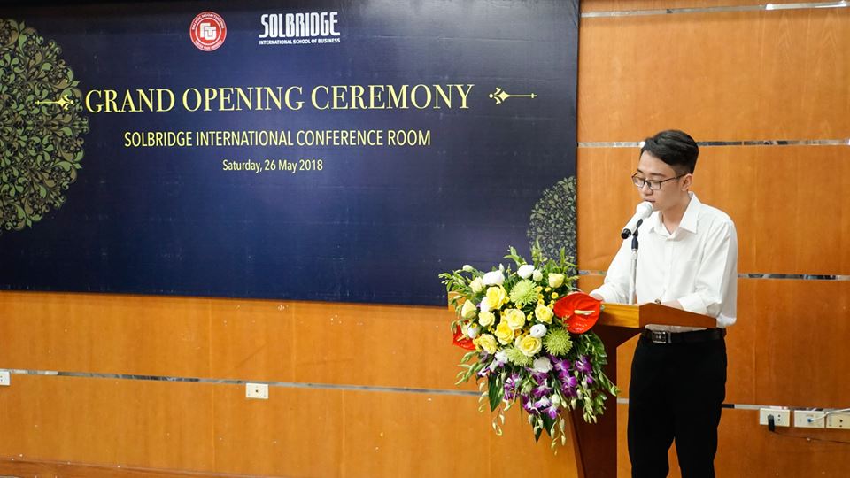 Phát biểu khai mạc, TS. Nguyễn Hải Ninh - Giám đốc Trung tâm Phát triển Quốc tế khẳng định chương trình liên kết 2 + 2 giữa trường Đại học Ngoại thương và trường KDQT Solbridge đã được thực hiện trong khoảng 6 tháng và thế hệ đầu tiên của chương trình được nhận được rất nhiều sự đầu tư. Chương trình không chỉ cung cấp cho sinh viên môi trường học tập tiên tiến mà còn hướng sinh viên trở thành những công dân toàn cầu. Thay mặt Trung tâm CID, TS. Nguyễn Hải Ninh gửi lời cảm ơn sâu sắc tới Ban giám hiệu trường Đại học Ngoại thương, Quỹ giáo dục Woosong, trường KDQT SolBridge đã hỗ trợ sửa chữa và thiết kế lại phòng học thành phòng Hội thảo quốc tế.