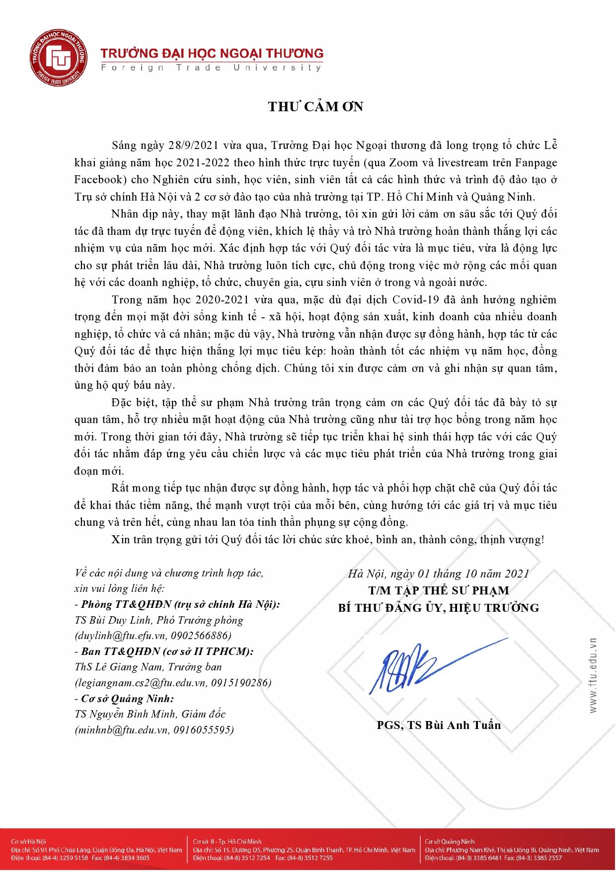 Tập thể sư phạm trường Đại học Ngoại thương xin trân trọng gửi đến Ban lãnh đạo Quý đối tác lời cảm ơn chân thành và tri ân sâu sắc vì đã luôn dành sự quan tâm, hỗ trợ và ủng hộ các hoạt động của Nhà trường trong suốt thời gian qua. Mong rằng, Quý doanh nghiệp, tổ chức sẽ tiếp tục là những đối tác tin cậy của Nhà trường trong thời gian tới để cùng tạo nên những giá trị gia tăng chung cho mỗi bên, cùng nhau lan tỏa tinh thần phụng sự cộng đồng - xã hội.