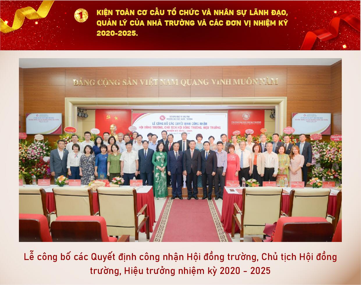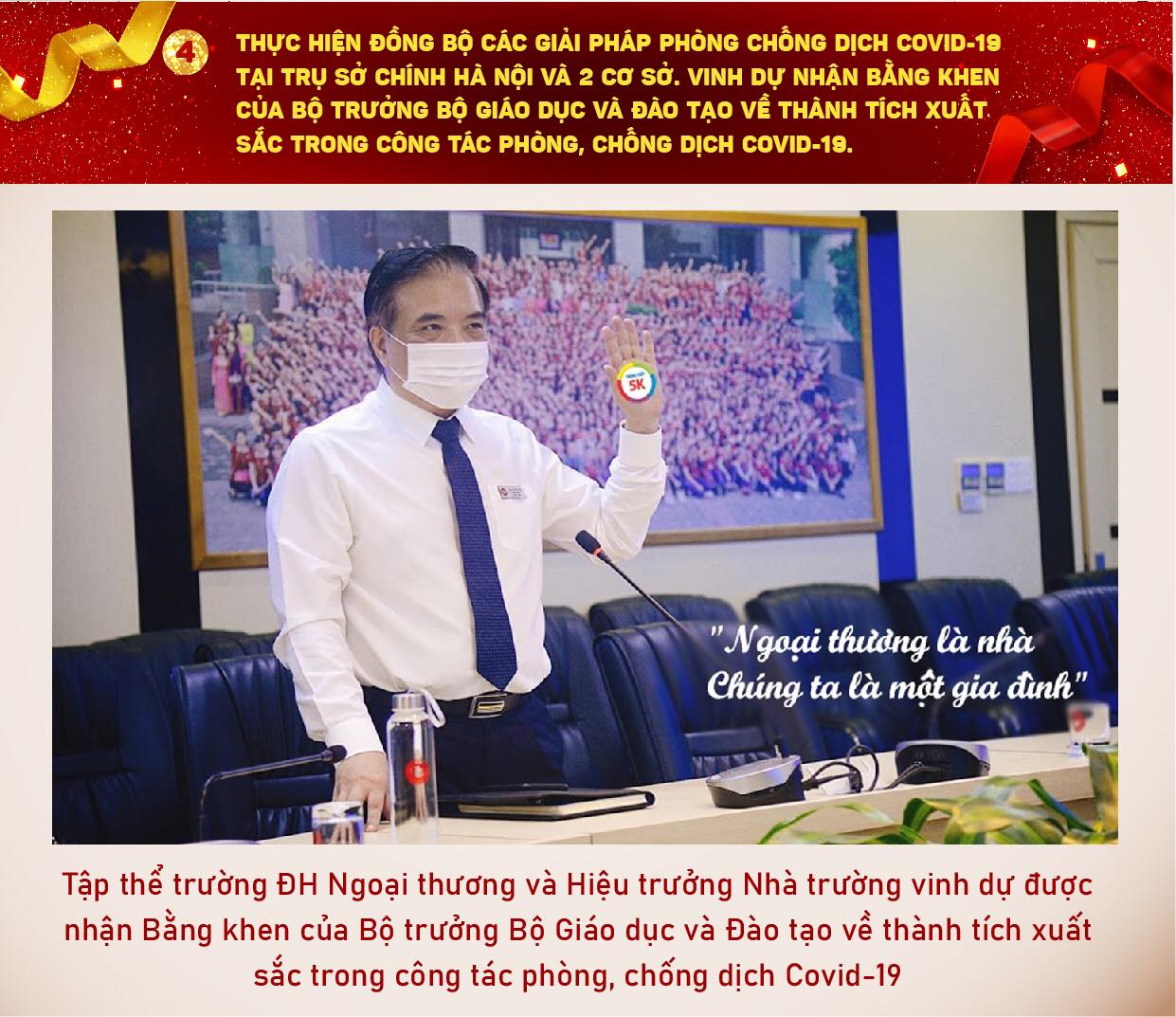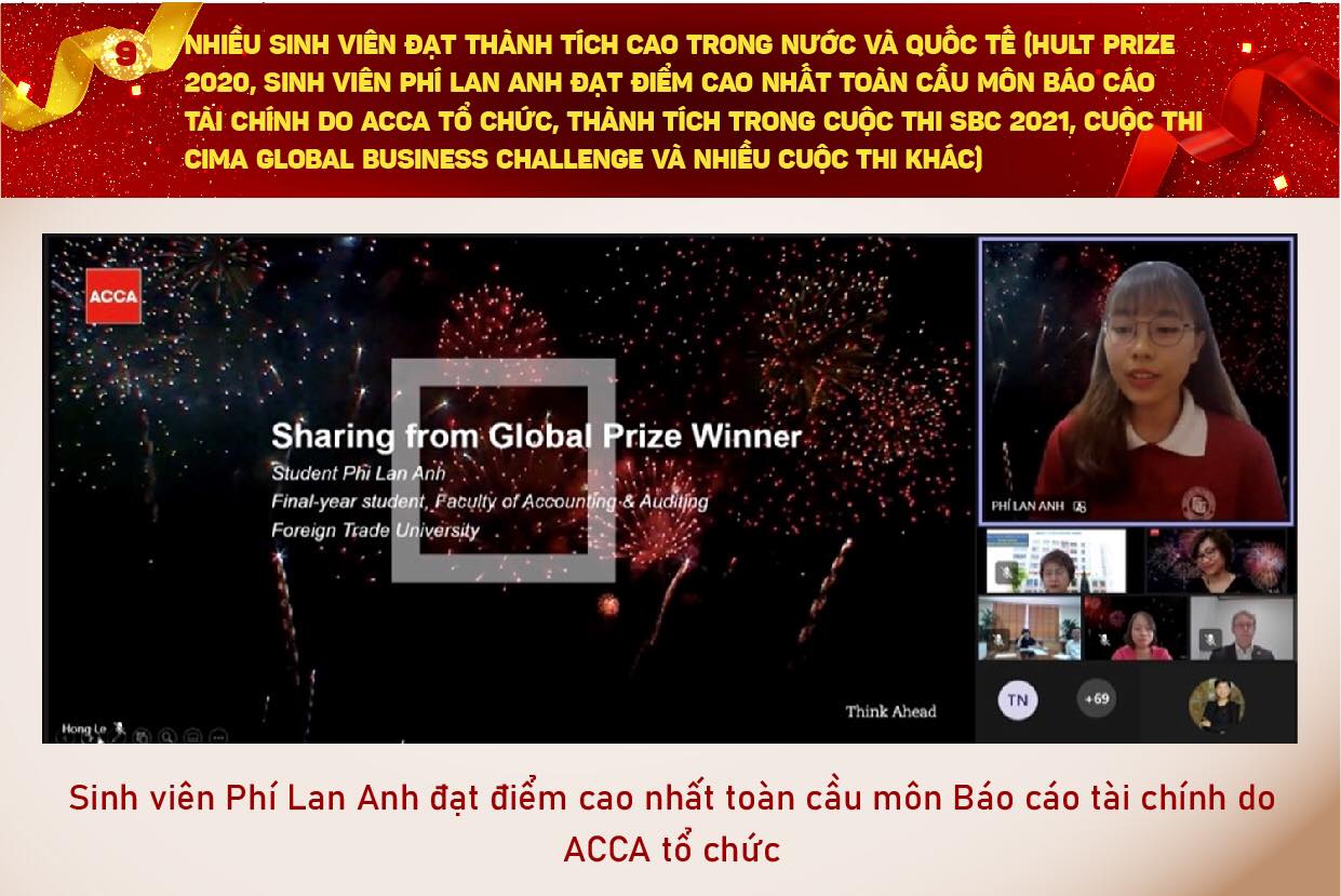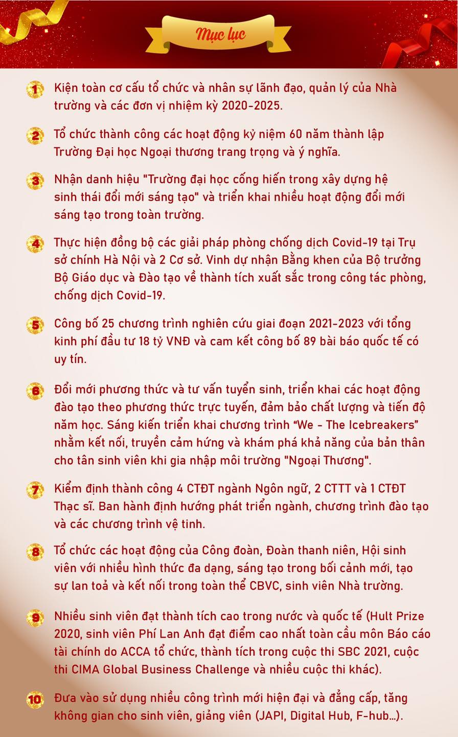 Trong năm học 2020 - 2021 vừa qua, tiếp tục phương châm “Khác biệt để dẫn đầu”, với tinh thần đoàn kết, tương trợ, sáng tạo vượt khó, trường ĐH Ngoại thương đã biến khó khăn, thách thức thành cơ hội, hoàn thành thắng lợi “nhiệm vụ kép” của năm học, vừa quyết liệt thực hiện các biện pháp phòng chống dịch, vừa triển khai có hiệu quả các mặt công tác của Nhà trường và đạt được nhiều kết quả đáng ghi nhận.