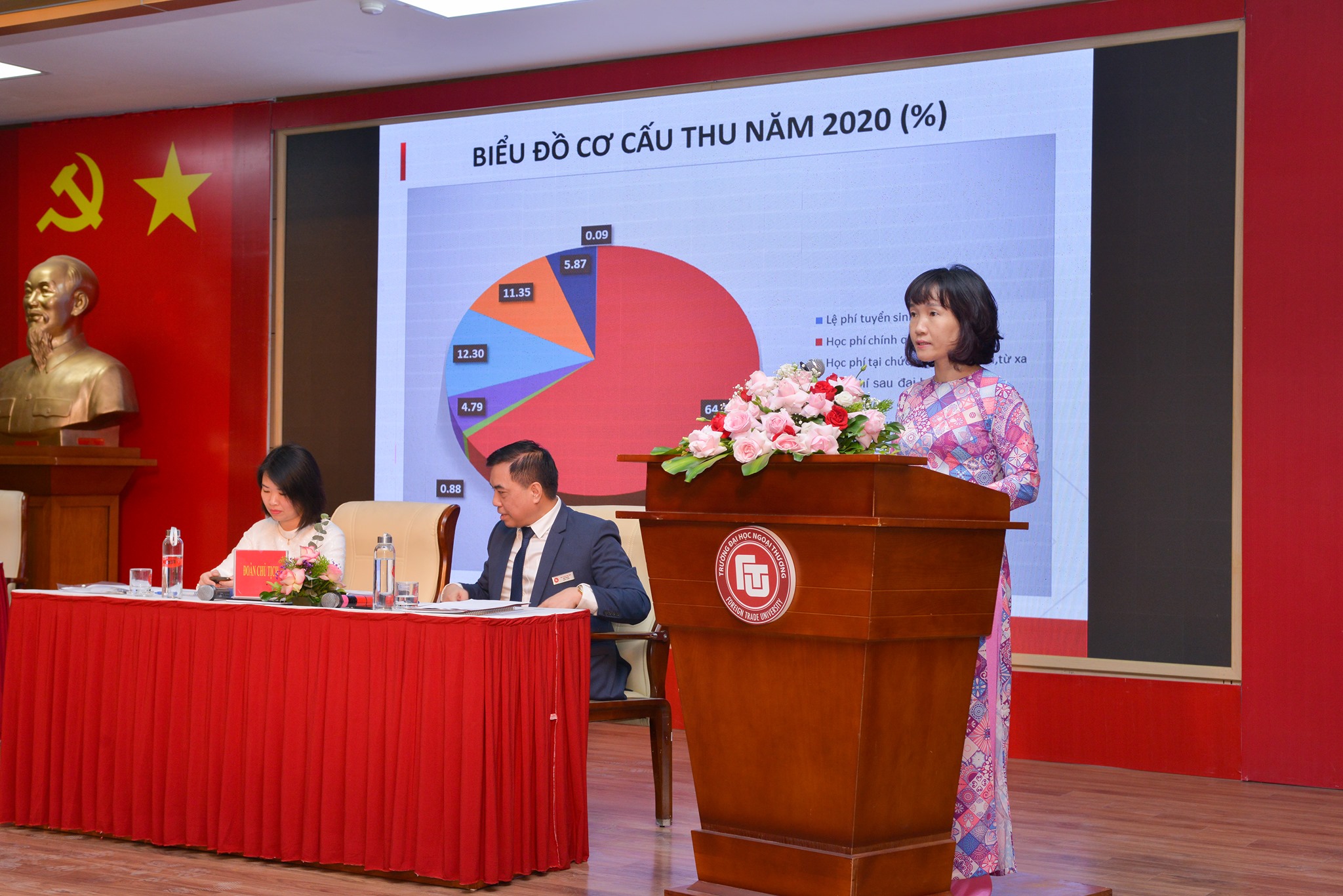 ThS. Trần Thị Mỹ Hạnh - Trưởng phòng Kế hoạch - Tài chính, Kế toán trưởng trình bày Báo cáo công khai quyết toán năm 2020, Báo cáo sử dụng các quỹ năm 2020 và báo cáo dự kiến thu - chi tài chính năm 2021, dự toán ngân sách năm 2022. Trong bối cảnh đại dịch Covid-19 kéo dài và diễn biến phức tạp, nhà trường chủ trương tiếp tục không tăng học phí năm học 2021-2022, đồng thời trực tiếp hỗ trợ học phí và có nhiều chính sách hỗ trợ sinh viên, học viên, viên chức gặp khó khăn ở cả 3 cơ sở đào tạo.