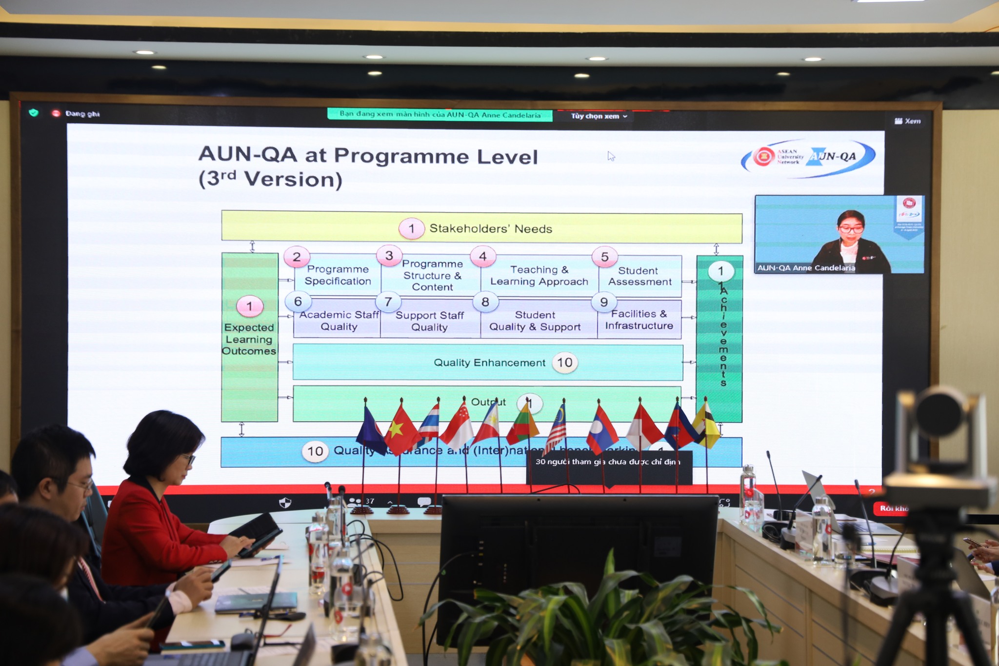 Tham dự phiên bế mạc về phía AUN có GS, TS Myrna S. Austria - Trưởng đoàn đánh giá, các Trưởng nhóm đánh giá và các chuyên gia trong đoàn đánh giá. Về phía trường ĐH Ngoại thương có PGS, TS Bùi Anh Tuấn - Hiệu trưởng; PGS, TS Lê Thị Thu Thủy - Chủ tịch Hội đồng trường; PGS, TS Phạm Thu Hương - Phó Hiệu trưởng; PGS, TS Đào Ngọc Tiến - Phó Hiệu trưởng; TS. Nguyễn Phúc Hiền - Giám đốc Trung tâm Khảo thí và Đảm bảo chất lượng; Trưởng các đơn vị phụ trách 2 chương trình đào tạo cùng lãnh đạo các đơn vị khác trong trường, đại diện cán bộ, giảng viên và người học.