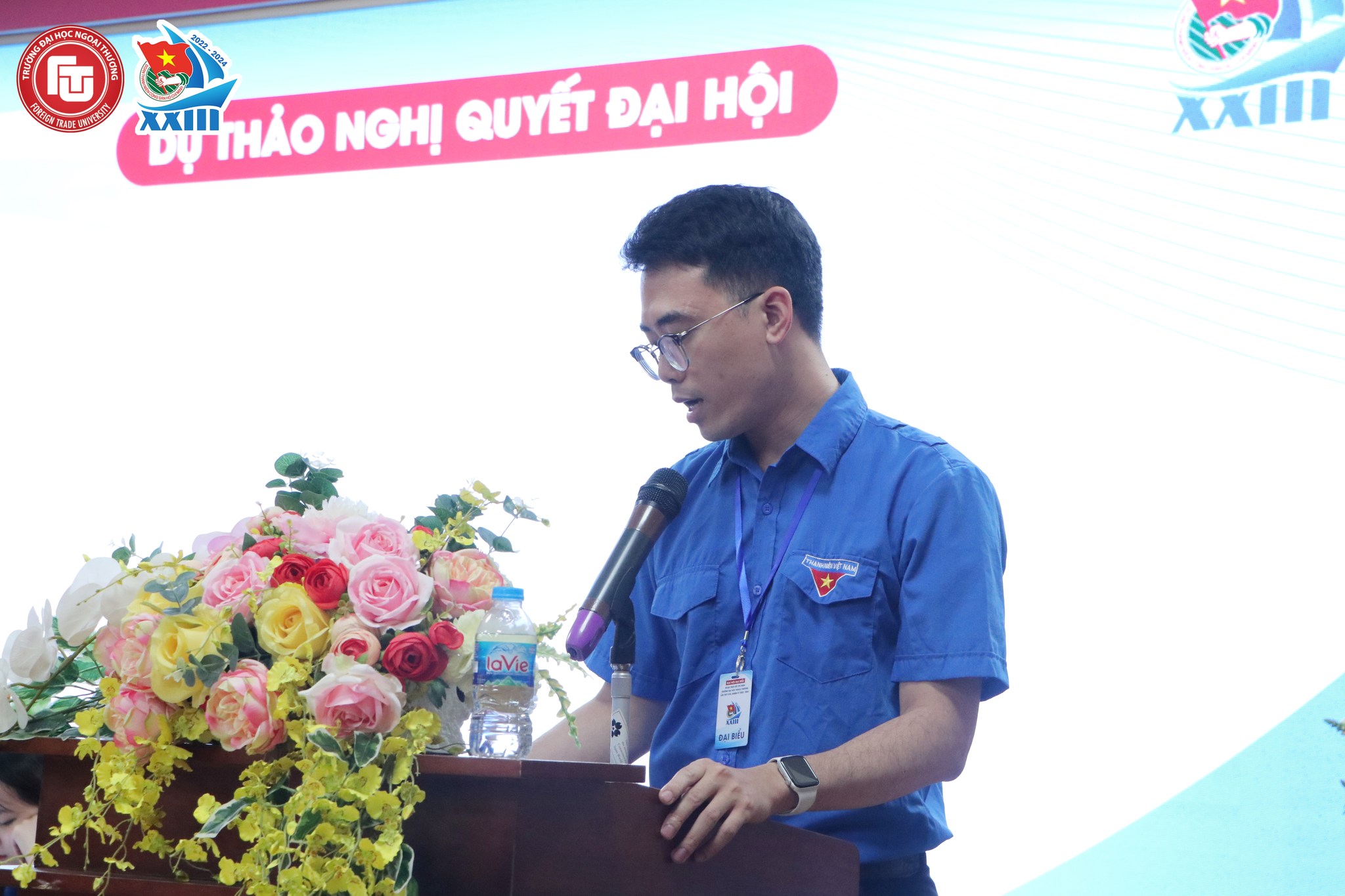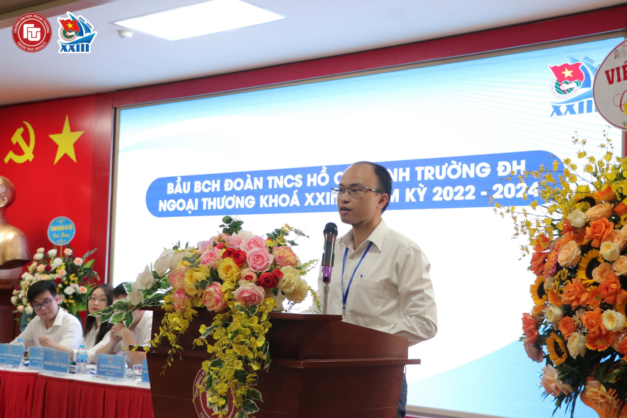 Đồng chí Võ Xuân Lộc đã thay mặt Đoàn Chủ tịch trình bày Báo cáo dự thảo đề án BCH Đoàn TNCS HCM trường ĐH Ngoại thương khóa XXIII, nhiệm kỳ 2022 - 2024 với danh sách đề cử 32 đồng chí được 100% đại biểu tham dự biểu quyết thông qua.