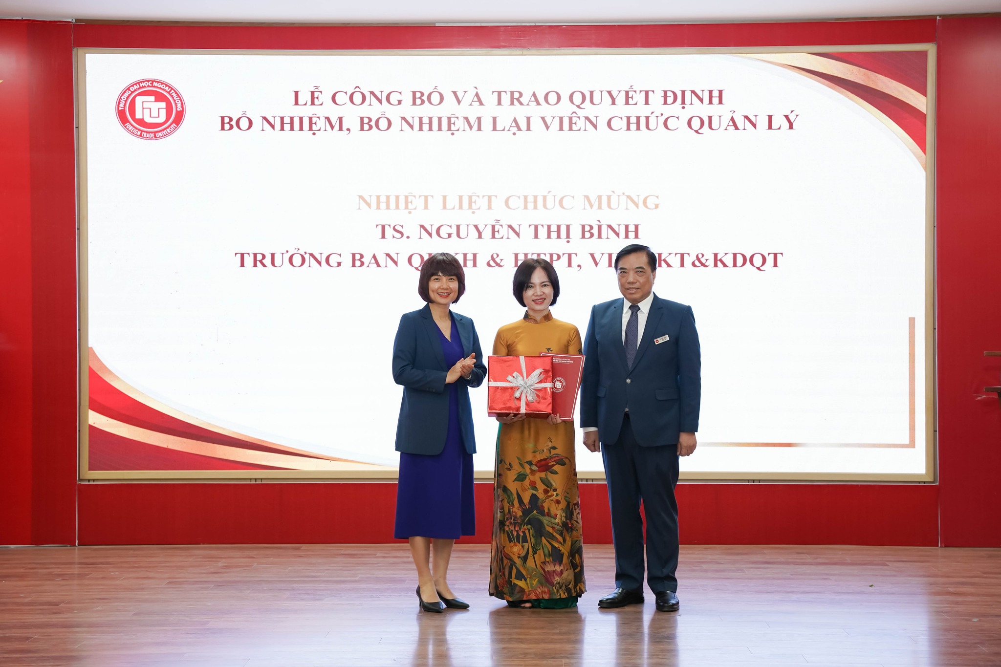 Trao Quyết định bổ nhiệm TS. Nguyễn Thị Bình giữ chức Trưởng ban Quản lý khoa học và Hợp tác phát triển, Viện Kinh tế và Kinh doanh quốc tế.