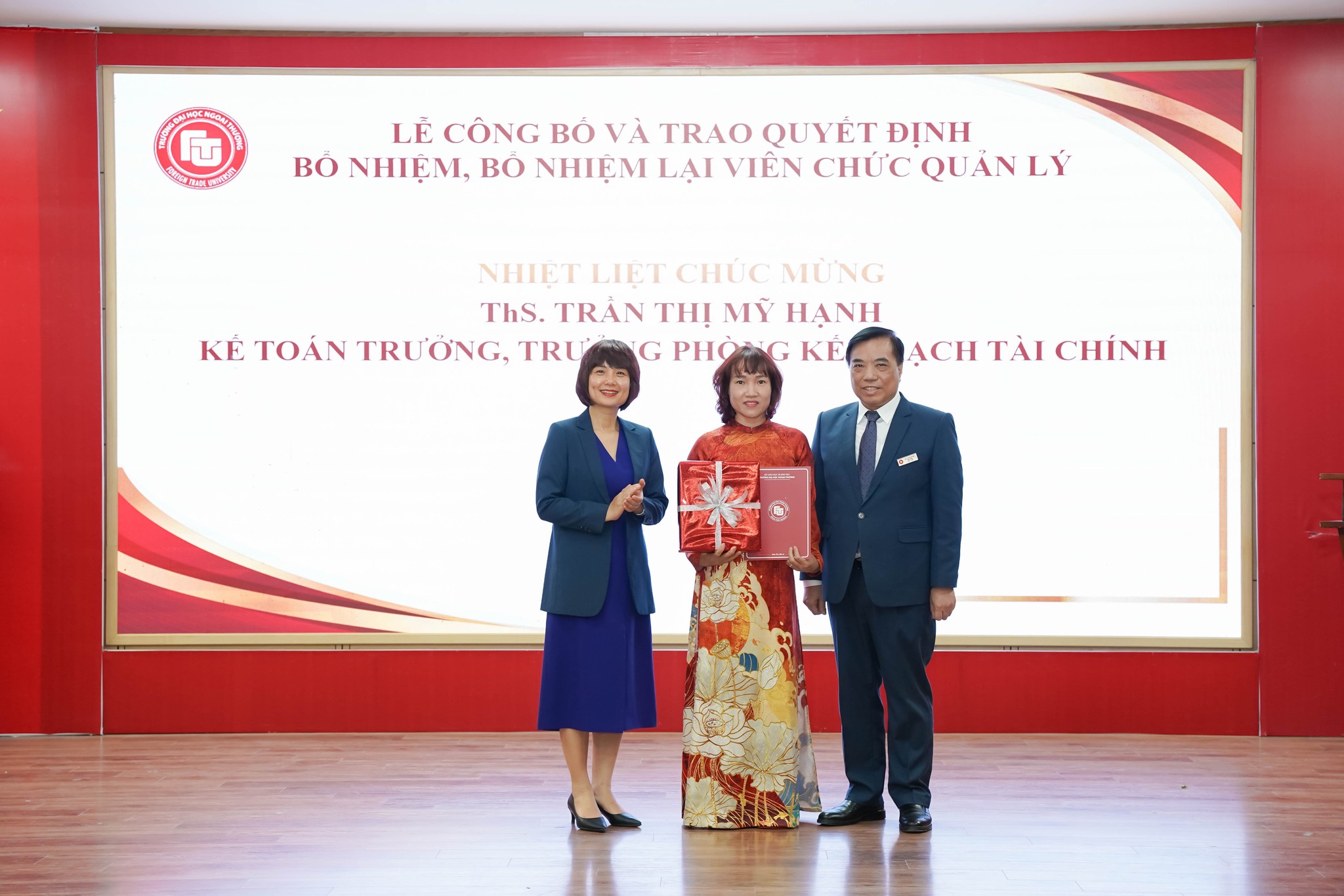 Trao Quyết định bổ nhiệm lại ThS. Trần Thị Mỹ Hạnh giữ chức Trưởng phòng Kế hoạch - Tài chính, Kế toán trưởng.