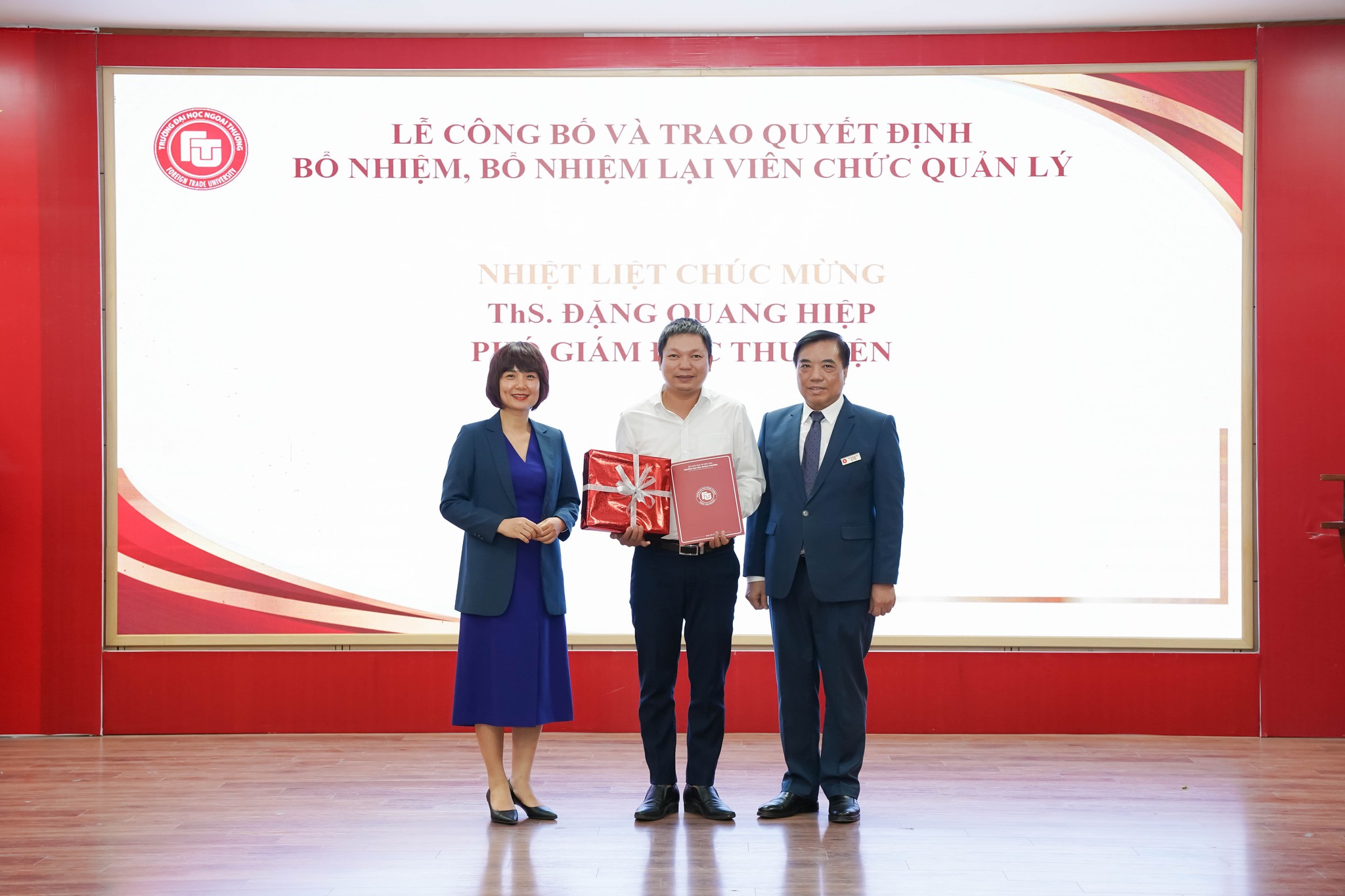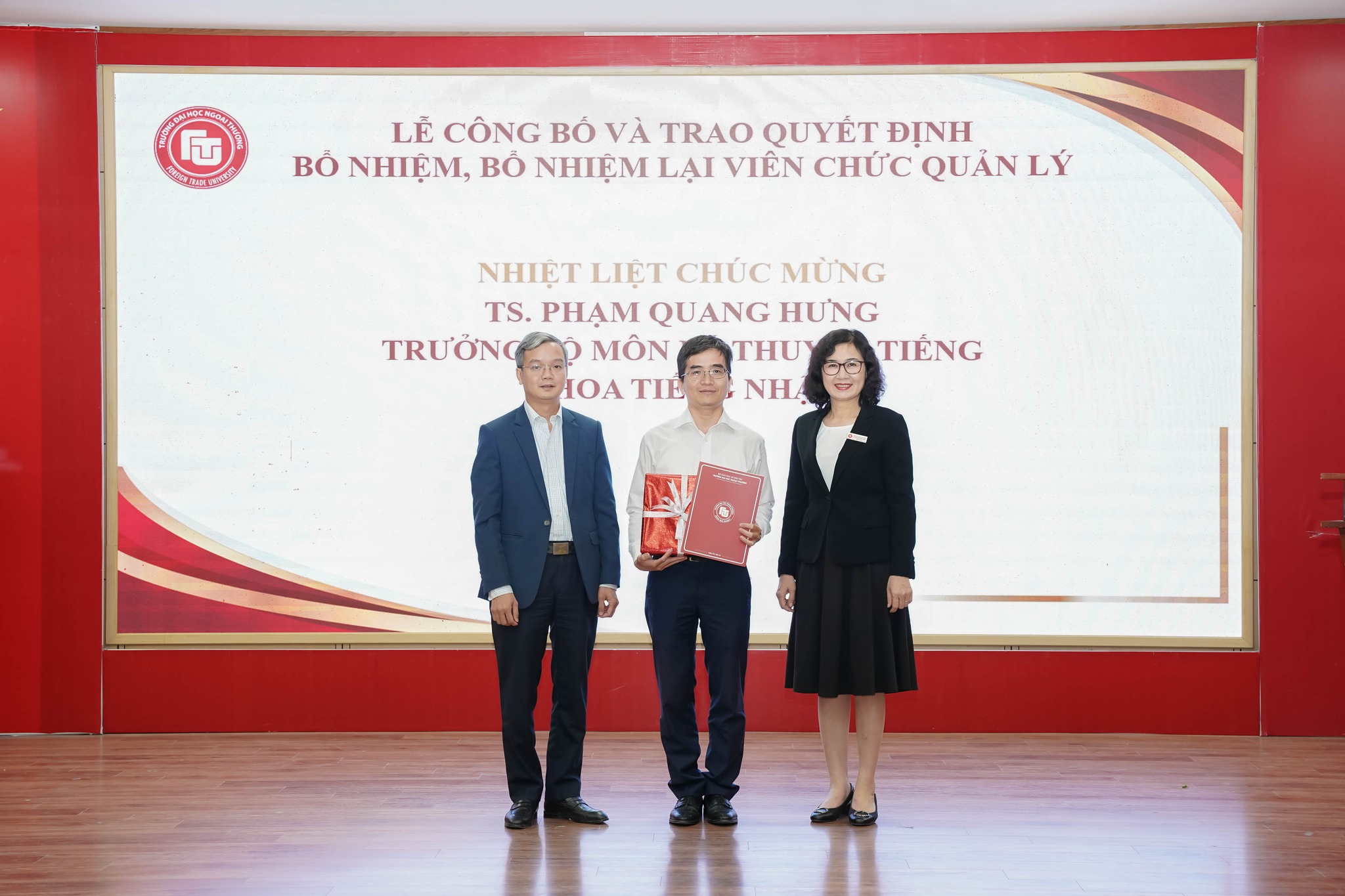 Tham dự buổi lễ có PGS, TS Bùi Anh Tuấn - Bí thư Đảng ủy, Hiệu trưởng Nhà trường; PGS, TS Lê Thị Thu Thủy - Phó Bí thư Đảng ủy, Chủ tịch Hội đồng trường; PGS, TS Phạm Thu Hương - Ủy viên BTV Đảng ủy, Phó Hiệu trưởng; PGS, TS Đào Ngọc Tiến - Phó Hiệu trưởng, lãnh đạo các đơn vị, các viên chức quản lý được bổ nhiệm, bổ nhiệm lại, bổ nhiệm chức danh Phó Giáo sư, cùng các cán bộ, viên chức Nhà trường.