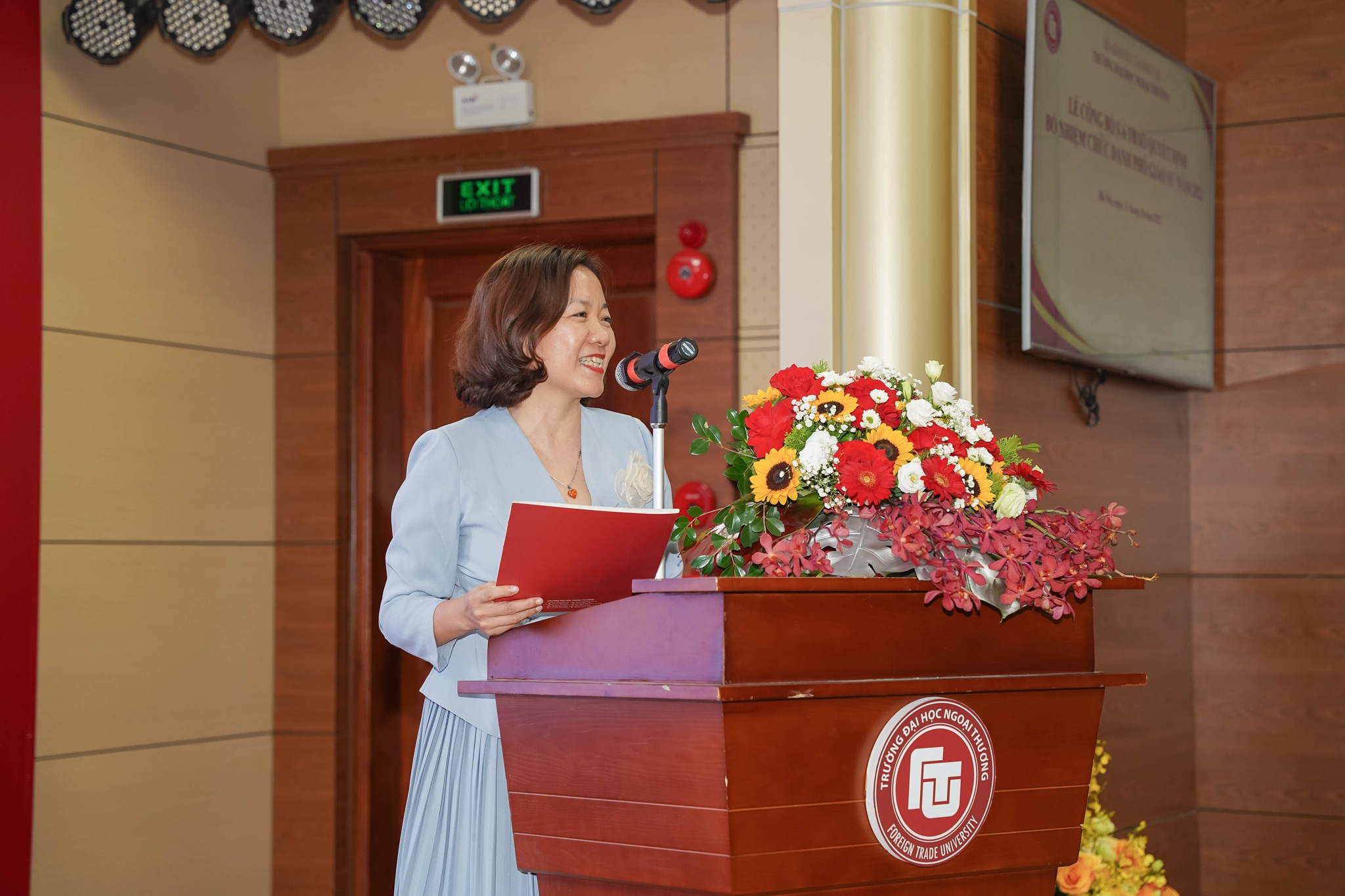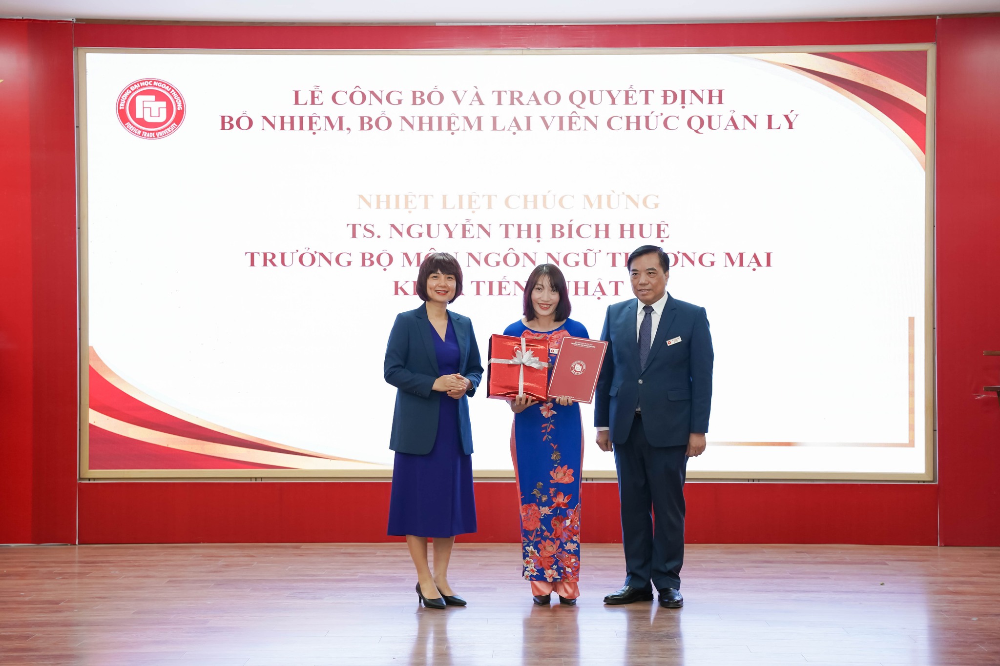 Trao Quyết định bổ nhiệm lại TS. Nguyễn Thị Bích Huệ giữ chức Trưởng Bộ môn Ngôn ngữ thương mại, Khoa Tiếng Nhật.