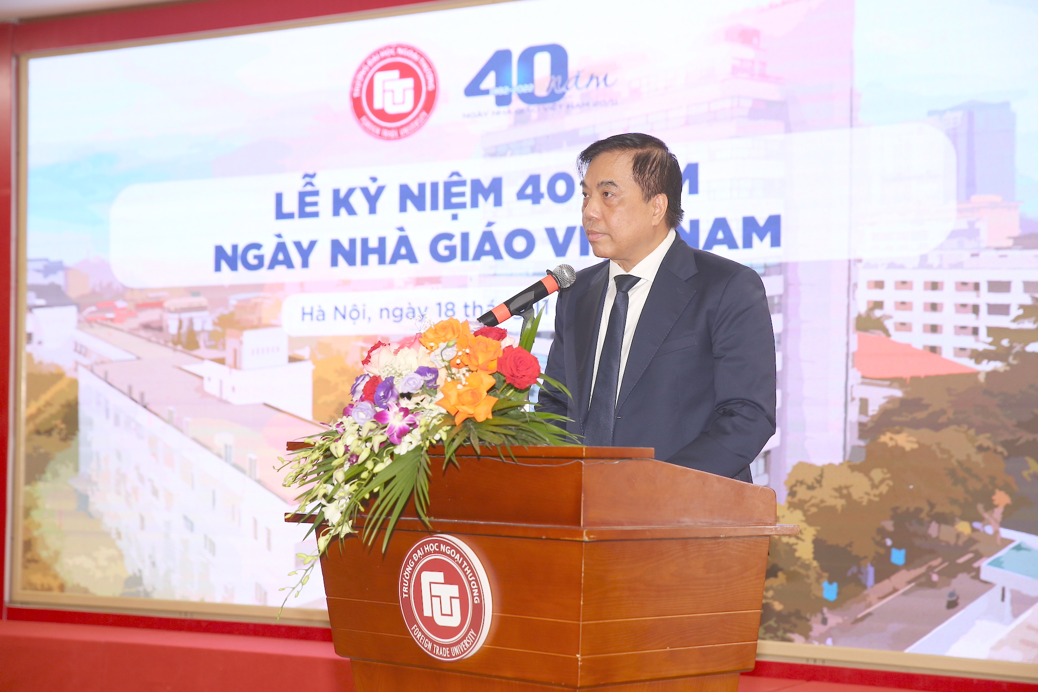 Hòa chung trong không khí cả nước chào mừng ngày 20/11, hôm nay, Trường Đại học Ngoại thương long trọng tổ chức Lễ Kỷ niệm 40 năm Ngày Nhà giáo Việt Nam (20/11/1982 - 20/11/2022). Nhân dịp này, thay mặt Tập thể lãnh đạo Trường, tôi xin gửi lời chúc mừng và lời tri ân sâu sắc tới các thế hệ lãnh đạo, viên chức, người lao động của Nhà trường, những người đã và đang có những cống hiến quan trọng cho sự nghiệp trồng người của Trường Đại học Ngoại thương hơn 60 năm qua.