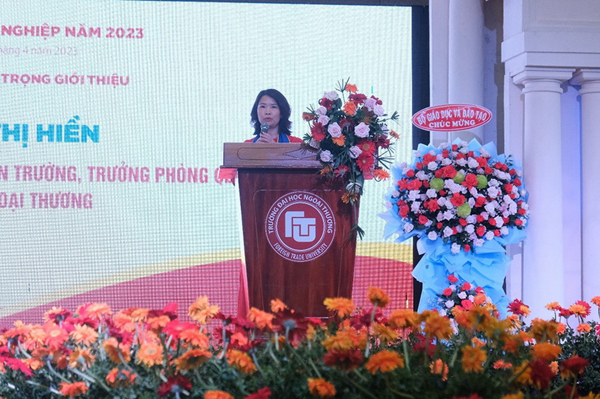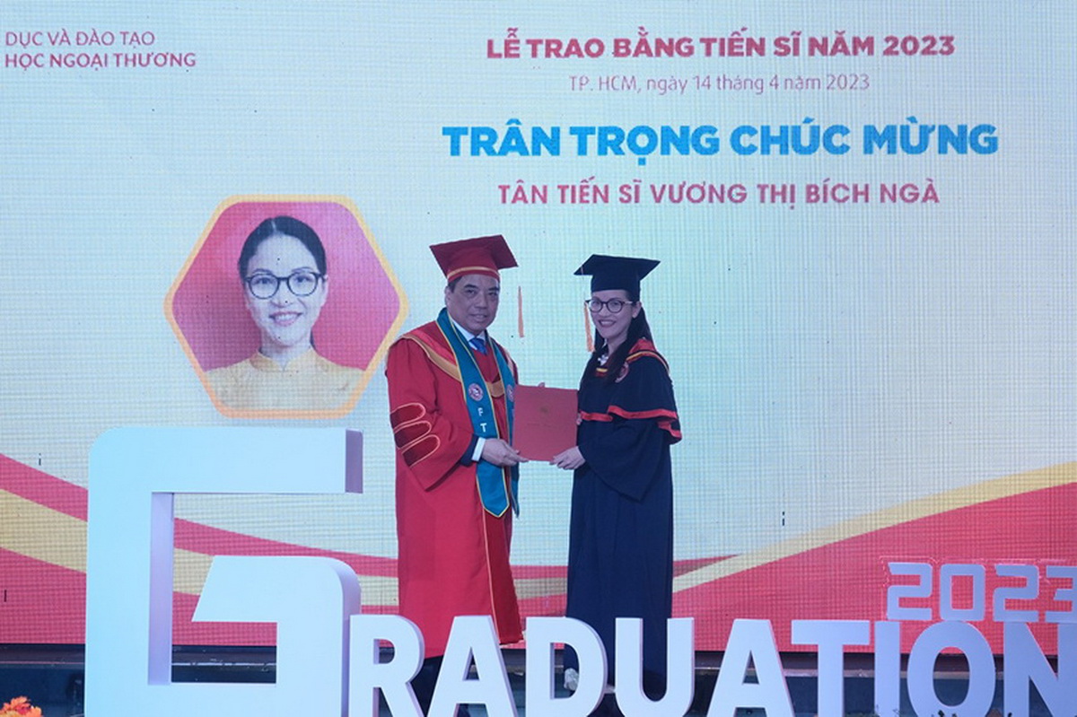 Tiếp nối chương trình, PGS, TS Vũ Thị Hiền đã công bố Quyết định công nhận tốt nghiệp cho tân Tiến sĩ, tân Thạc sĩ và tân Cử nhân nhằm chứng nhận quá trình học tập và rèn luyện tại Trường ĐH Ngoại thương của các nghiên cứu sinh, học viên cao học và sinh viên. Theo Quyết định 622-626/QĐ-ĐHNT ngày 07/03/2023, Trường ĐH Ngoại thương công nhận tốt nghiệp 01 tân tiến sĩ ngành Kinh tế quốc tế, 02 tân Thạc sĩ ngành Quản trị kinh doanh, 01 tân thạc sĩ ngành Tài chính ngân hàng, 298 tân cử nhân ngành Kinh tế, 64 tân cử nhân ngành Quản trị kinh doanh, 71 tân cử nhân ngành Tài chính ngân hàng, 31 tân cử nhân ngành Kế toán, 02 tân cử nhân ngành Kinh doanh quốc tế, 68 tân cử nhân đào tạo trực tuyến.