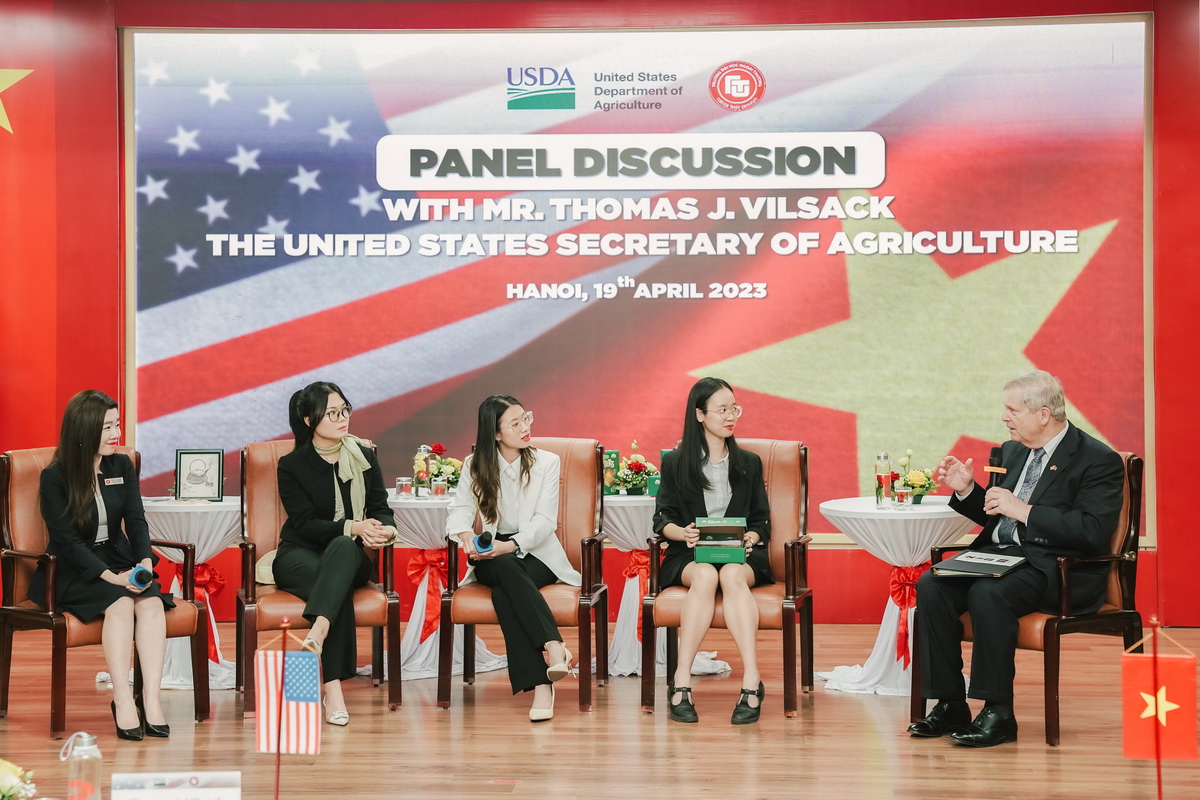 Bộ trưởng Bộ Nông nghiệp Hoa Kỳ Vilsack trao đổi với sinh viên về tầm quan trọng của quan hệ Hoa Kỳ - Việt Nam đối với thế hệ lãnh đạo tương lai và tầm quan trọng của sáng tạo nông nghiệp và thương mại trong việc đảm bảo tương lai bền vững, thân thiện với môi trường, và an ninh lương thực. Ngài Bộ trưởng cho biết đây là lần thứ 3 ông đến Việt Nam, và mỗi lần ông đều thán phục trước sự phát triển và sức sống mạnh mẽ của đất nước Việt Nam. Năm 2023 đánh dấu mốc kỷ niệm 10 năm quan hệ đối tác toàn diện Việt – Hoa Kỳ, đồng thời cũng là thời điểm then chốt trong mối quan hệ hợp tác giữa Việt Nam và Hoa Kỳ trong nông nghiệp. Trong bối cảnh thế giới hiện nay, với các vấn đề nhức nhối, như từ biến đổi khí hậu đến chuỗi cung ứng bị gián đoạn do COVID-19 và xung đột ở Ukraine.… đã đưa an ninh lương thực trở thành vấn đề cần chú ý. Đặc biệt khi chi phí đầu vào và năng lượng tăng và tất cả các vấn đề đang diễn ra trong chuỗi cung ứng đã kết hợp lại, mang đến nhiều thách thức chưa từng có cho toàn cầu.