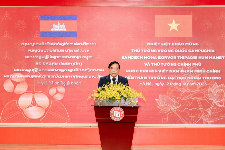 Phát biểu chào mừng, PGS, TS Bùi Anh Tuấn đã nhiệt liệt chào mừng và bày tỏ vinh dự khi Tập thể sư phạm, sinh viên Nhà trường được tiếp đón Thủ tướng Chính phủ Phạm Minh Chính và Thủ tướng Vương quốc Campuchia Samdech Moha Borvor Thipadei Hun Manet. Thầy Hiệu trưởng chia sẻ, Nhà trường tự hào đã góp phần trong việc đào tạo nhân lực chất lượng cao cho Vương Quốc Campuchia, đồng hành với sự phát triển bền vững của nước bạn, góp phần tích cực trong việc củng cố và phát triển mối quan hệ giữa 2 nước Việt Nam và Campuchia. Nhà trường đã đào tạo nhiều sinh viên từ Vương Quốc Campuchia trong các chương trình đào tạo ngành kinh tế, kinh doanh, thương mại và quan hệ kinh tế Á - u, quản trị đổi mới sáng tạo và nhiều lĩnh vực khác. Thầy Hiệu trưởng cũng bày tỏ mong muốn tiếp tục hợp tác mật thiết với các trường, các viện nghiên cứu, cơ sở giáo dục của Campuchia trong đào tạo, nghiên cứu, tư vấn chính sách và đặc biệt trong phát triển hệ sinh thái đổi mới sáng tạo và khởi nghiệp, thúc đẩy khả năng tự thân của giới trẻ hai nước.