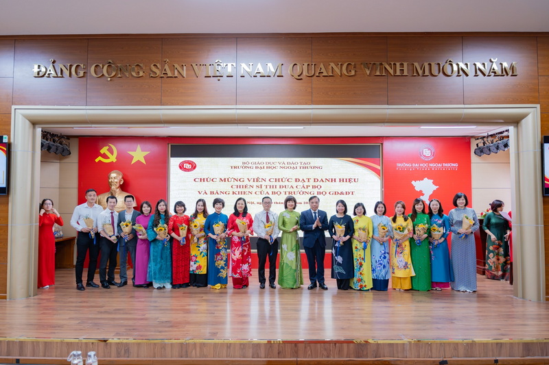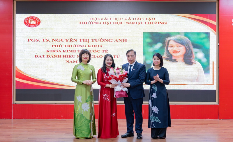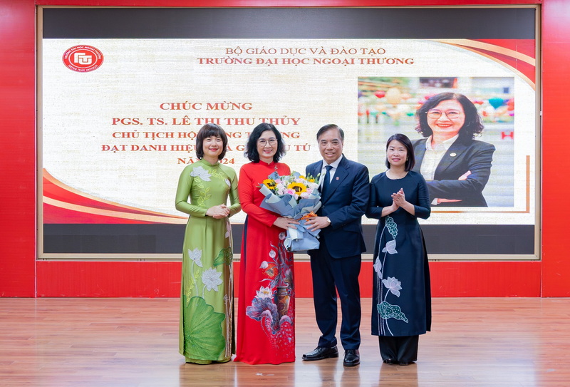 Trong khuôn khổ buổi lễ, Tập thể lãnh đạo Nhà trường đã trao tặng bó hoa tươi thắm thay lời chúc mừng tới hai nhà giáo ưu tú mới được phong tặng danh hiệu của Trường ĐH Ngoại thương năm 2024: PGS, TS Lê Thị Thu Thuỷ - Chủ tịch Hội đồng Trường và PGS, TS Nguyễn Thị Tường Anh - Phó Trưởng Khoa Kinh tế Quốc tế.
