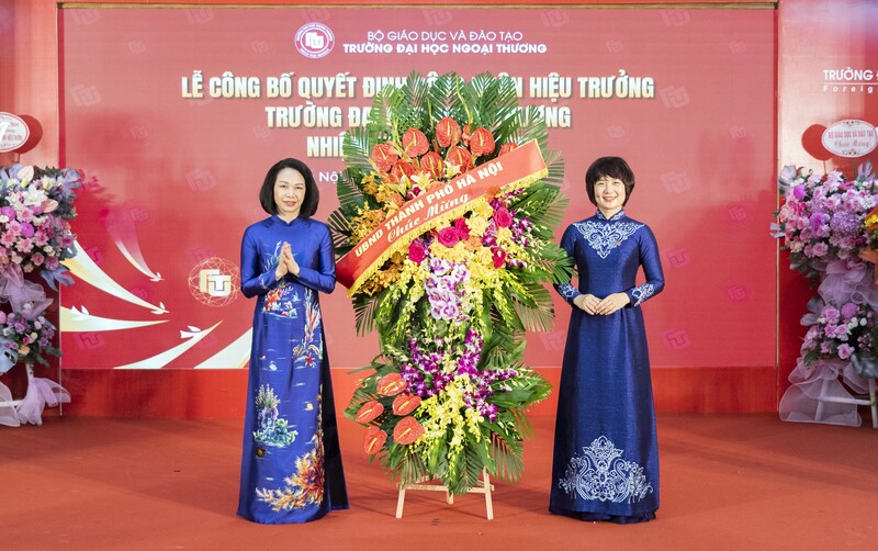 Bà Vũ Thu Hà - Thành ủy viên, Phó Chủ tịch UBND TP Hà Nội tặng hoa và chúc mừng Tân Hiệu trưởng Trường Đại học Ngoại thương.