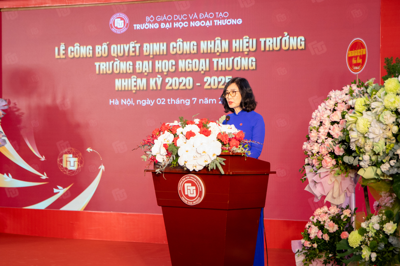 Phát biểu tại buổi lễ, PGS, TS Phạm Thu Hương - Tân Hiệu trưởng Nhà trường bày tỏ xúc động và vinh dự khi chính thức được trao trọng trách Hiệu trưởng Trường Đại học Ngoại thương. PGS, TS Phạm Thu Hương cũng gửi lời cảm ơn sâu sắc tới Đảng bộ, Lãnh đạo Bộ Giáo dục và Đào tạo, Đảng ủy Khối các trường ĐH, CĐ Hà Nội, Đảng ủy - Hội đồng trường - Tập thể Lãnh đạo Trường cùng Tập thể sư phạm Nhà trường đã tín nhiệm, giao phó trọng trách quan trọng này. Cùng với đó, là sự tin tưởng, chỉ dẫn đồng hành của các thế hệ Lãnh đạo Nhà trường qua các thời kỳ, giúp PGS, TS Phạm Thu Hương có cơ hội được thử thách và rèn luyện, luôn tạo những điều kiện tốt nhất để tôi khắc phục được hạn chế và phát huy được các thế mạnh của bản thân.