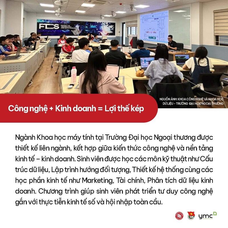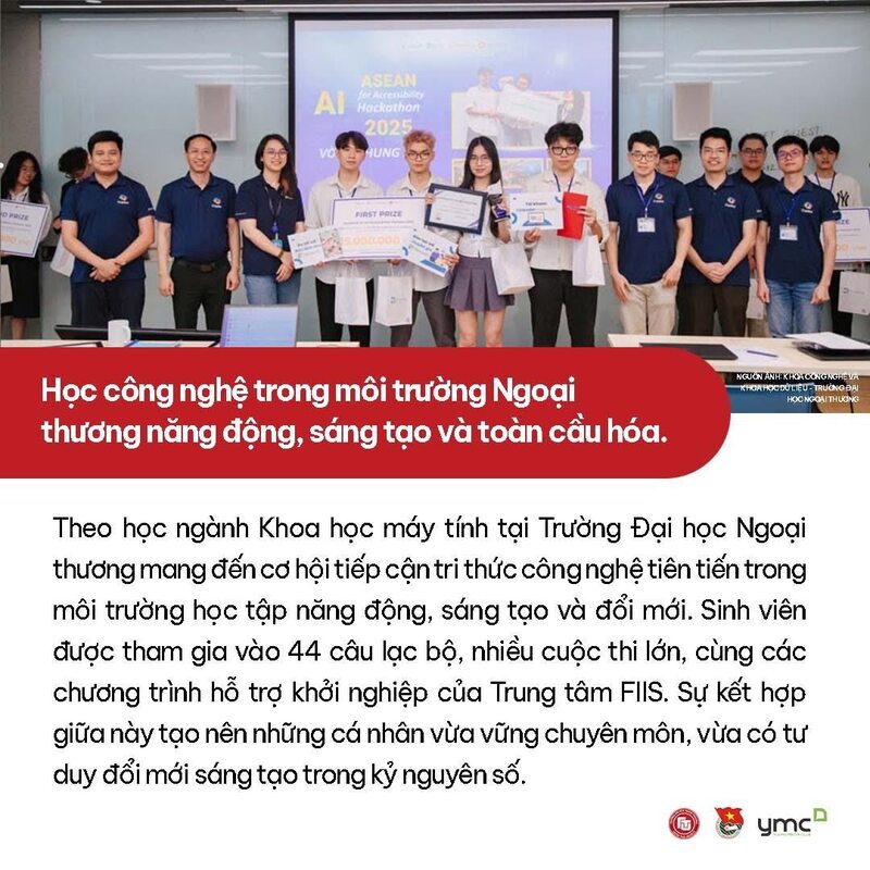 Đặc biệt, với nền tảng công nghệ và kinh tế được tích lũy trong môi trường năng động của Ngoại thương, sinh viên còn có thể lựa chọn khởi nghiệp, trở thành nhà sáng lập và điều hành doanh nghiệp của chính mình. Theo học ngành Khoa học máy tính tại Trường Đại học Ngoại thương không chỉ mang đến cơ hội tiếp cận tri thức công nghệ tiên tiến mà còn mở ra hành trình trải nghiệm trong một môi trường học tập năng động, sáng tạo và tích cực đổi mới. Với 44 câu lạc bộ sinh viên hoạt động sôi nổi ở nhiều lĩnh vực cùng các cuộc thi quy mô lớn, sinh viên có cơ hội phát triển toàn diện bên cạnh chương trình học chính khóa.
