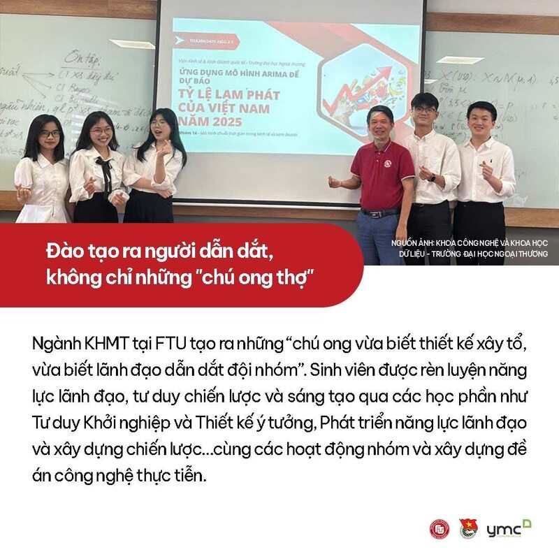 Ngành Khoa học máy tính tại FTU không chỉ đào tạo những “chú ong thợ” miệt mài viết code, mà sẽ tạo ra những “chú ong vừa biết thiết kế xây tổ, vừa biết lãnh đạo dẫn dắt đội nhóm”. Chương trình đào tạo chú trọng phát triển tư duy lãnh đạo, tinh thần đổi mới sáng tạo và khả năng khởi nghiệp, giúp sinh viên không chỉ giỏi chuyên môn mà còn có năng lực làm chủ trong một thế giới công nghệ không ngừng thay đổi.