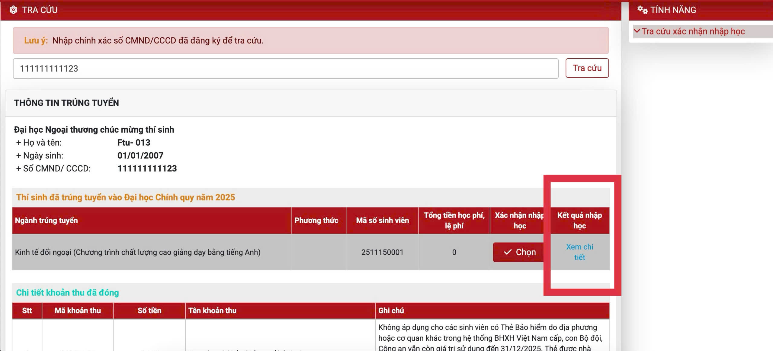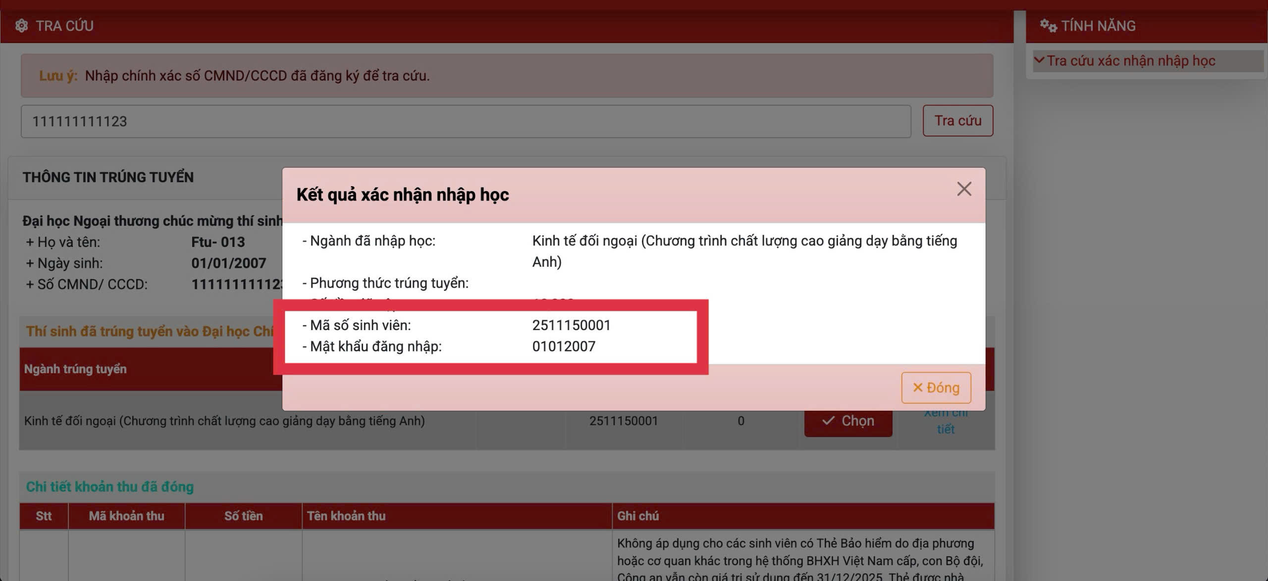 Sau khi hoàn thành thanh toán học phí qua hệ thống thành công, thí sinh bấm nút “Xem chi tiết” tại Bảng thông tin kết quả nhập học để xem thông tin đăng nhập hệ thống, cụ thể như sau: