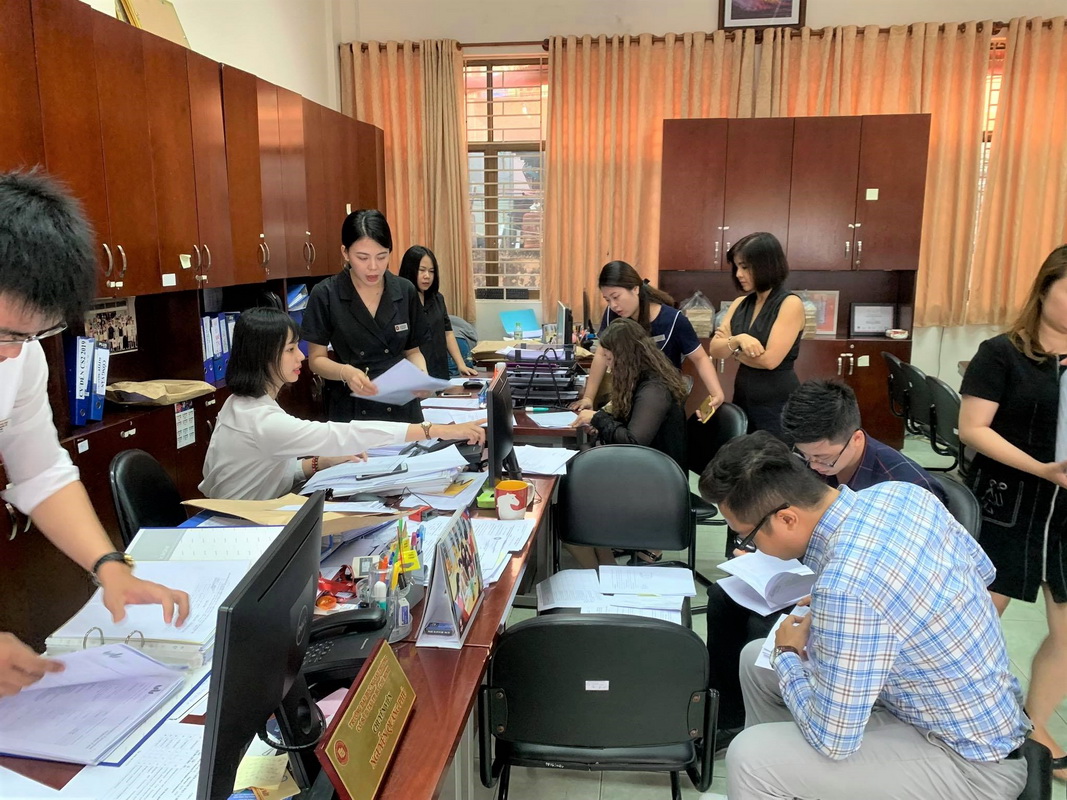 Ảnh 3: Chuyên viên Khoa Đào tạo Quốc tế phối hợp với Ban Đào tạo Quốc tế Cơ sở 2 trong việc rà soát các văn bản, giấy tờ trong bộ hồ sơ, giấy phép quản lý chương trình