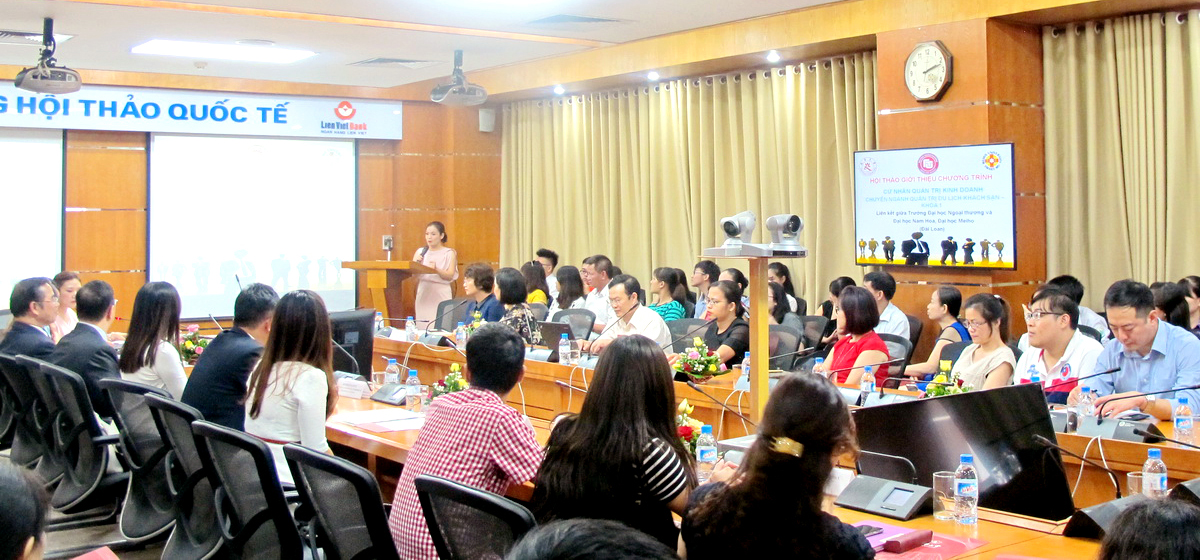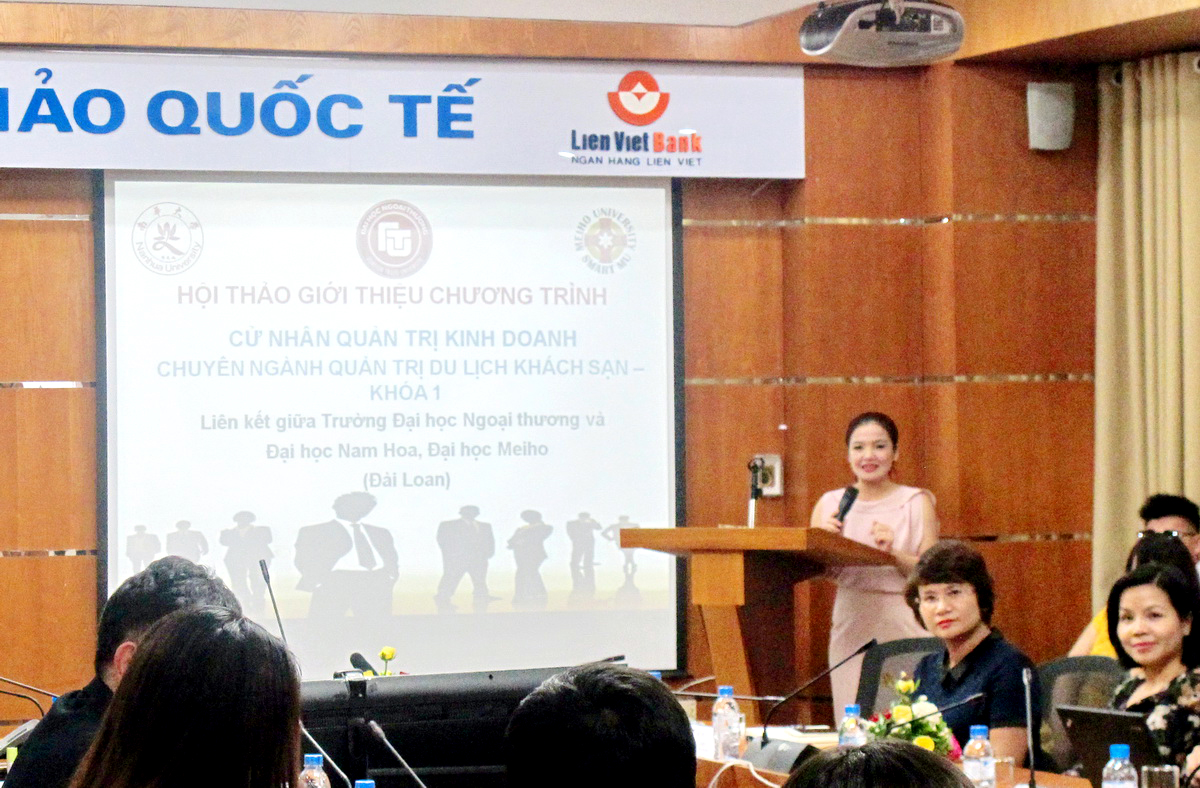Nhằm đưa thông tin một cách chính xác nhất tới các em học sinh và phụ huynh, giúp các em học sinh tìm hiểu rõ hơn về chương trình, chiều ngày 23/8/2016, trường Đại học Ngoại thương đã tổ chức Hội thảo chương trình liên kết đào tạo giữa trường Đại học Ngoại thương và Đại học Nam Hoa chuyên ngành Quản trị Du lịch khách sạn. Buổi hội thảo đã nhận được sự quan tâm của nhiều cơ quan, tổ chức cấp cao. Tới dự buổi Hội thảo, trường Đại học Ngoại thương vinh dự được tiếp đón: TS Tung-Yi Lee – Tham tán Khoa học, Văn phòng Kinh tế -Văn hóa Đài Bắc; Ngài Diệp Kiến Đức - Trưởng Đại diện Hội thương gia Đài Loan; Ngài Wu Wann Yi – Phó Hiệu trưởng Đại học Nam Hoa; Bà Meggi Tran – Đại diện Đại học Nam Hoa tại Hà Nội. Về phía trường Đại học Ngoại thương, có: PGS, TS Nguyễn Thu Thủy – Phó Hiệu trưởng trường Đại học Ngoại thương; PGS, TS Hồ Thúy Ngọc – Trưởng khoa Đào tạo quốc tế, giảng viên và đông đảo cơ quan báo đài, học sinh, phụ huynh quan tâm tới tham dự chương trình.